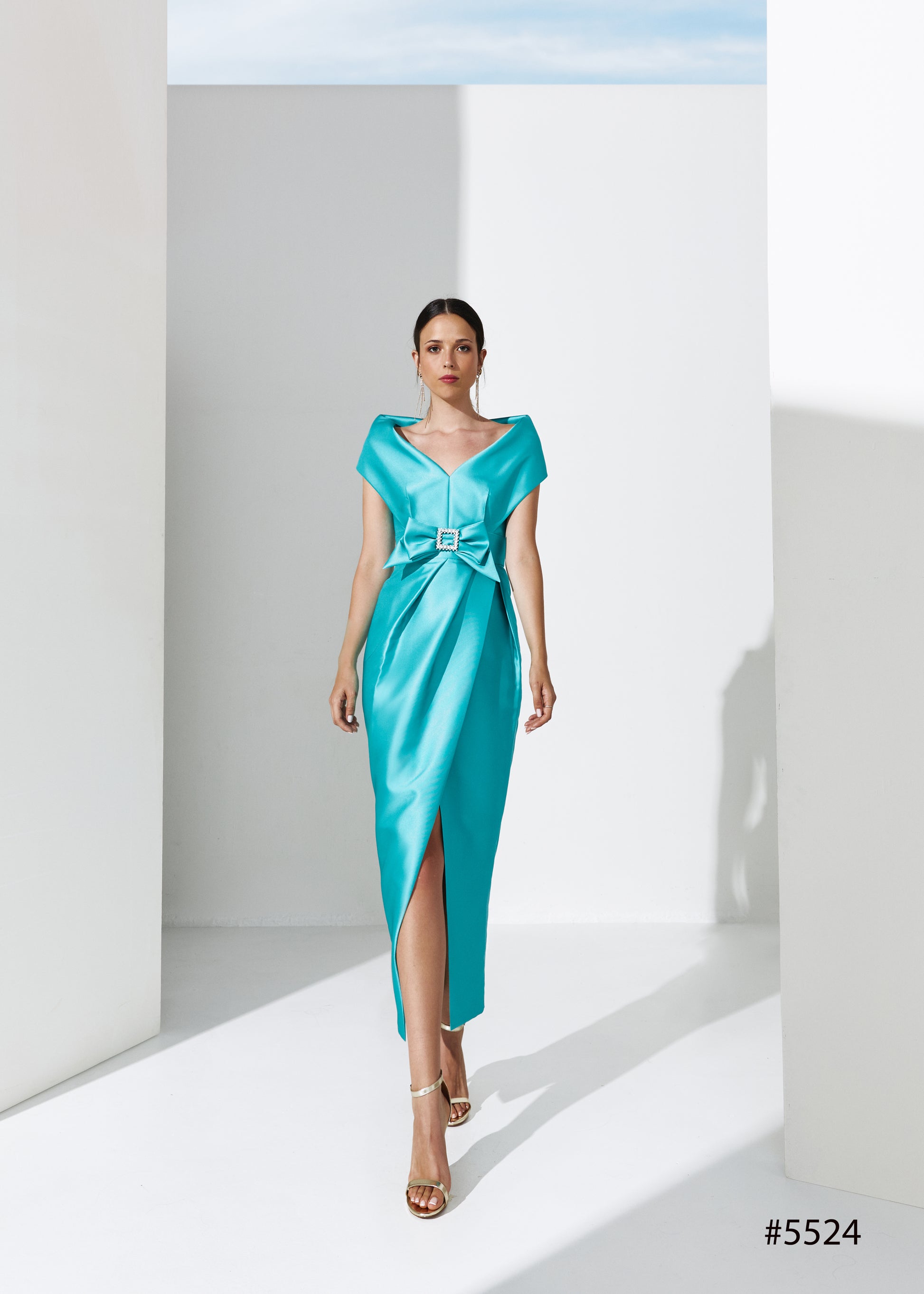 ABITO IN MIKADO CON SCOLLO OMERALE E CINTURINO