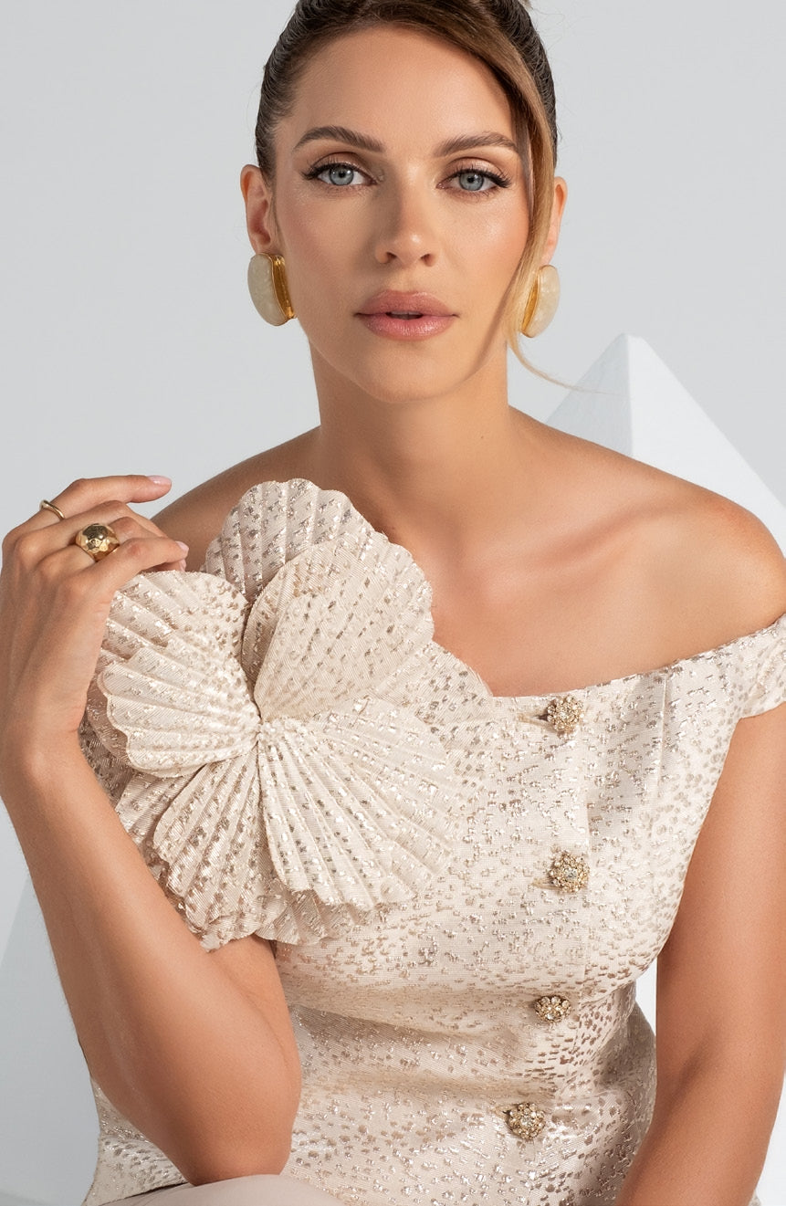 BUSTIER SCOLLATURA OMERALE CON BOTTONI CRISTALLO, PANTALONE PALAZZO IN CHIFFON. APPLICAZIONE FLOREALE