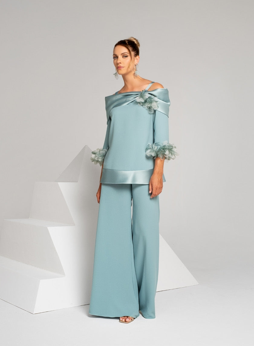 PANTALONE PALAZZO IN CADI, CORPETTO CON RASO SULLO SCOLLO E SUL FONDO E APPLIOCAZIONI FLOREALI SUI POLSINI