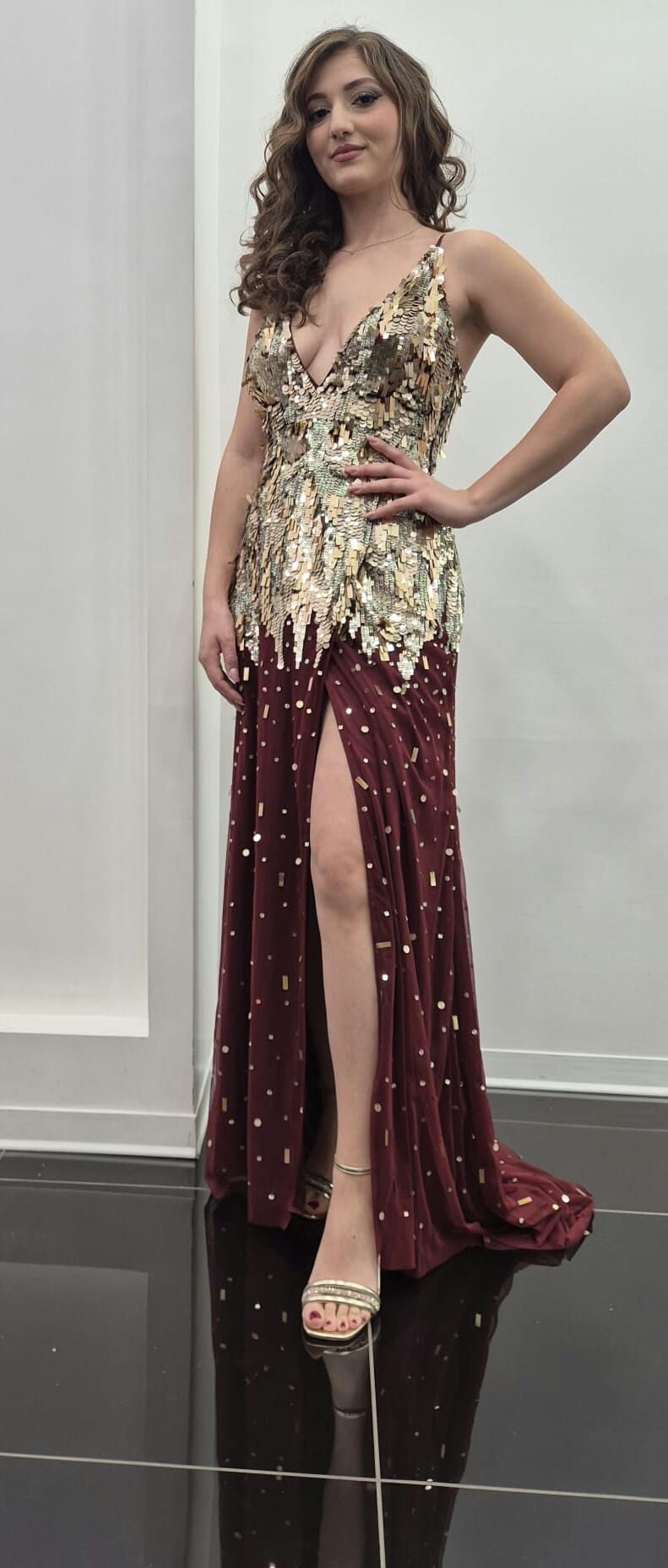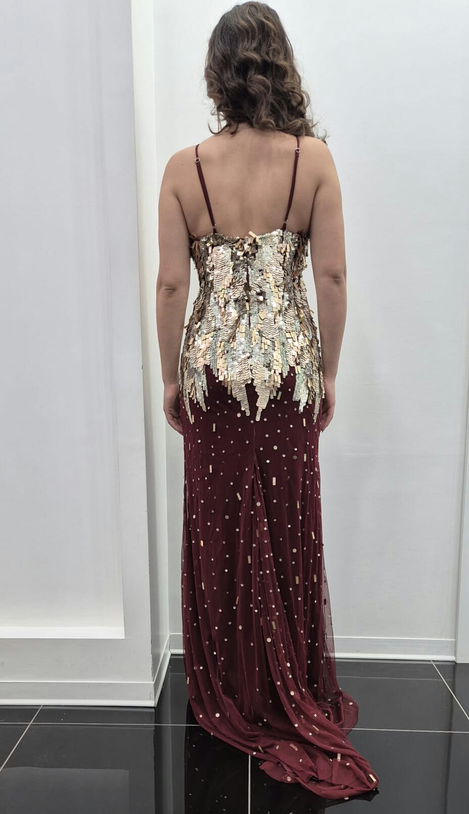 ABITO LUNGO, CORPETTO CON APPLICAZIONI DI PAILLETTES IN COLORE ORO, GONNA COLOR BORDEAUX CON SPACCO SULLA GAMBA SINISTRA.