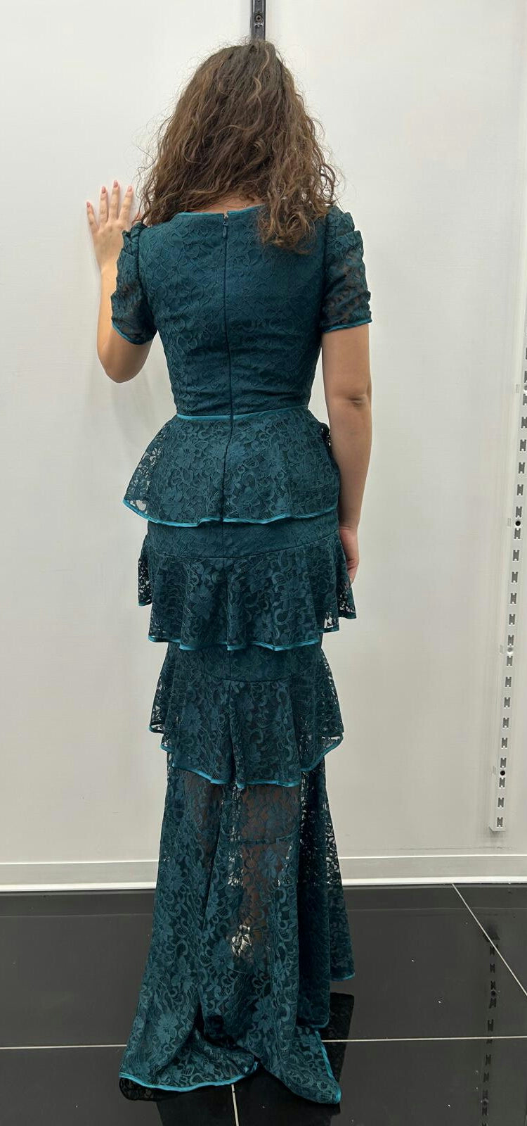 L'ABITO PRESENTA UN CORPETTO CON PIZZO  E UNA GONNA A SIRENA DECORATA CON BALZE E VOLANT IN PIZZO AU PIU' LIVELLI,CHE CREANO UN EFFETTO CASCATA. LA GONNA SI ALLARGA A PARTIRE DALLE GINOCCHIA