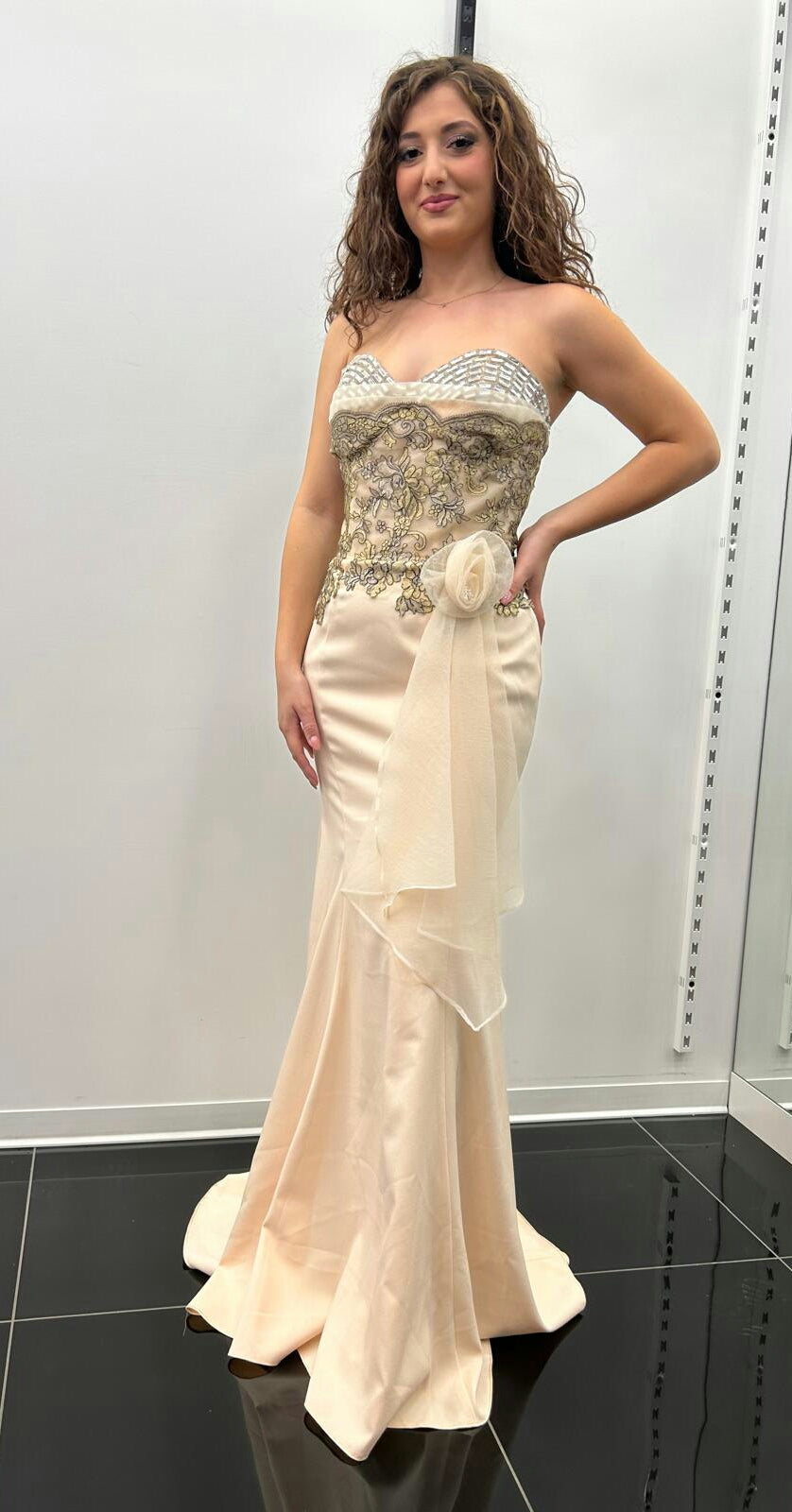 ABITO LUNGO A SIRENA CON CORPETTO A SCOLLATURA A CUORE. IL CORPETTO E' ARRICCHITO DA PUNTI LUCE, MENTRE LA GONNA E' IN RASO LISCIO COLOR CHAMPAGNE. E' PRESENTE UN DETTAGLIO FLOREALE IN TESSUTO SUL FIANCO CON DRAPPEGGIO IN ORGANZA CHE SCENDE LUNGO LA PARTE ANTERIORE DELLA GONNA.