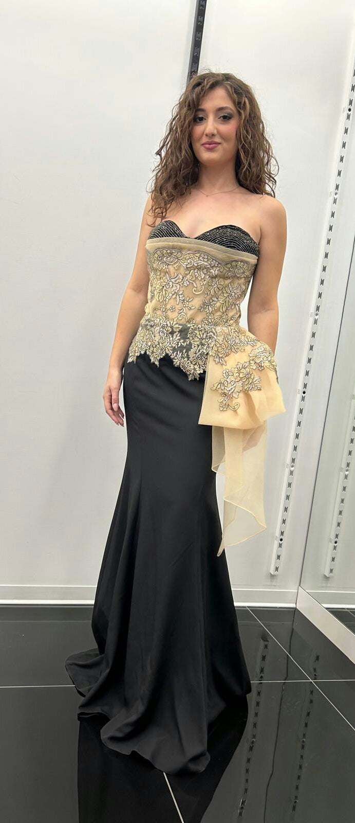 ELEGANTE MODELLO DA SERA CON SILHOUETTE A SIRENA. PRESENTA UN CORPETTO CON  SCOLLATURA A CUORE, RICAMATO CON PIETRE DI COLORE NERO. LA GONNA E' REALIZZATA IN TESSUTO LISCIO, DI UN INTENSO COLORE NERO. LA SUA FOMA A SIRENA ADERISCE AI FIANCHI E SI ALLARGA GRADUALMENTE VERSO IL BASSO, TERMINANDO IN UNA LEGGERA CODA.