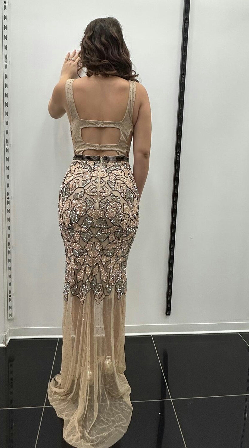 L'ABITO E' RICCAMENTE DECORATO CON PERLINE E PAILLETTES, PRESENTA UNO SCOLLO A V PROFONDO E SPALLINE SOTTILI.