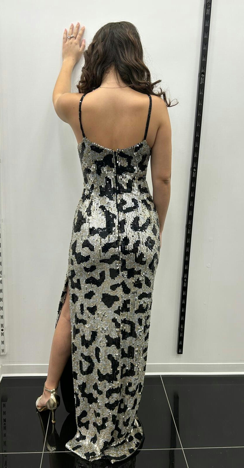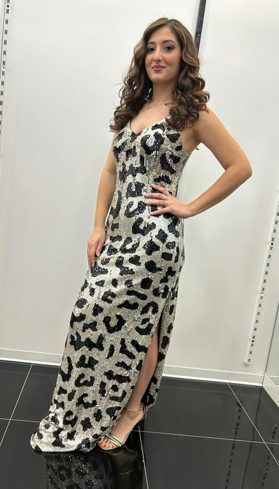 L'ABITO E' UN ABITO LUNGO DA SERA CON STAMPA LEOPARDATA. PRESENTA UNO SCOLLO A V E SPALLINE SOTTILI. L'ABITO E' CARATTERIZZATO DA UNO SPACCO LATERALE CHE AGGIUNGE UN ELEMENTO SEXY ED ELEGANTE. E' INTERAMENTE RICOPERTO DI PAILLETTES CHE CREANO UNA FINITURA BRILLANTE.