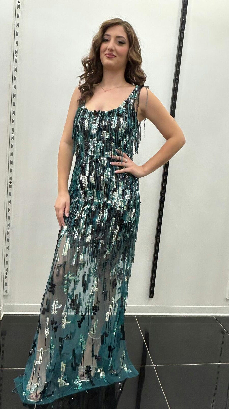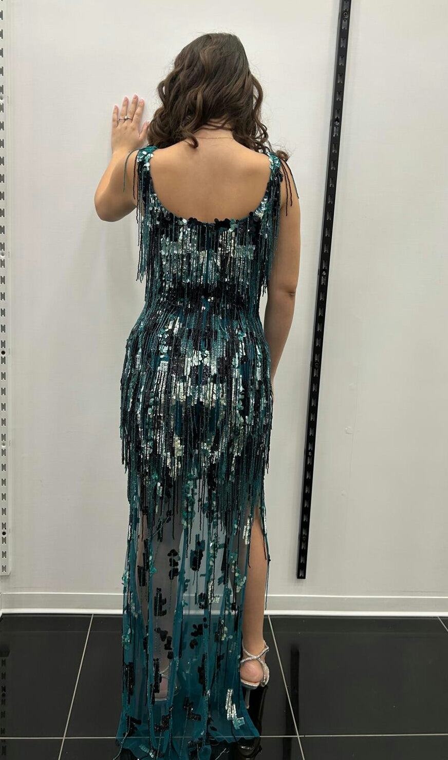 L'ABITO PRESENTA UNA COMBINAZIONE DI COLORI CHE INCLUDE PRINCIPALMENTE TONALITA' DI VERDE TIFFANY, NERO E SPAZZI DI ARGENTO,DISPOSTI IN UN ASTRATTO. L'ELEMENTO PRINCIPALE SONO LE FRANGE DI PAILLETTES CHE PENDONO VERTICALMENTE SU TUTTA LA LUNGHEZZA DEL VESTITO, CONFERENDOGLI MOVIMENTO E BRILLANTEZZA.