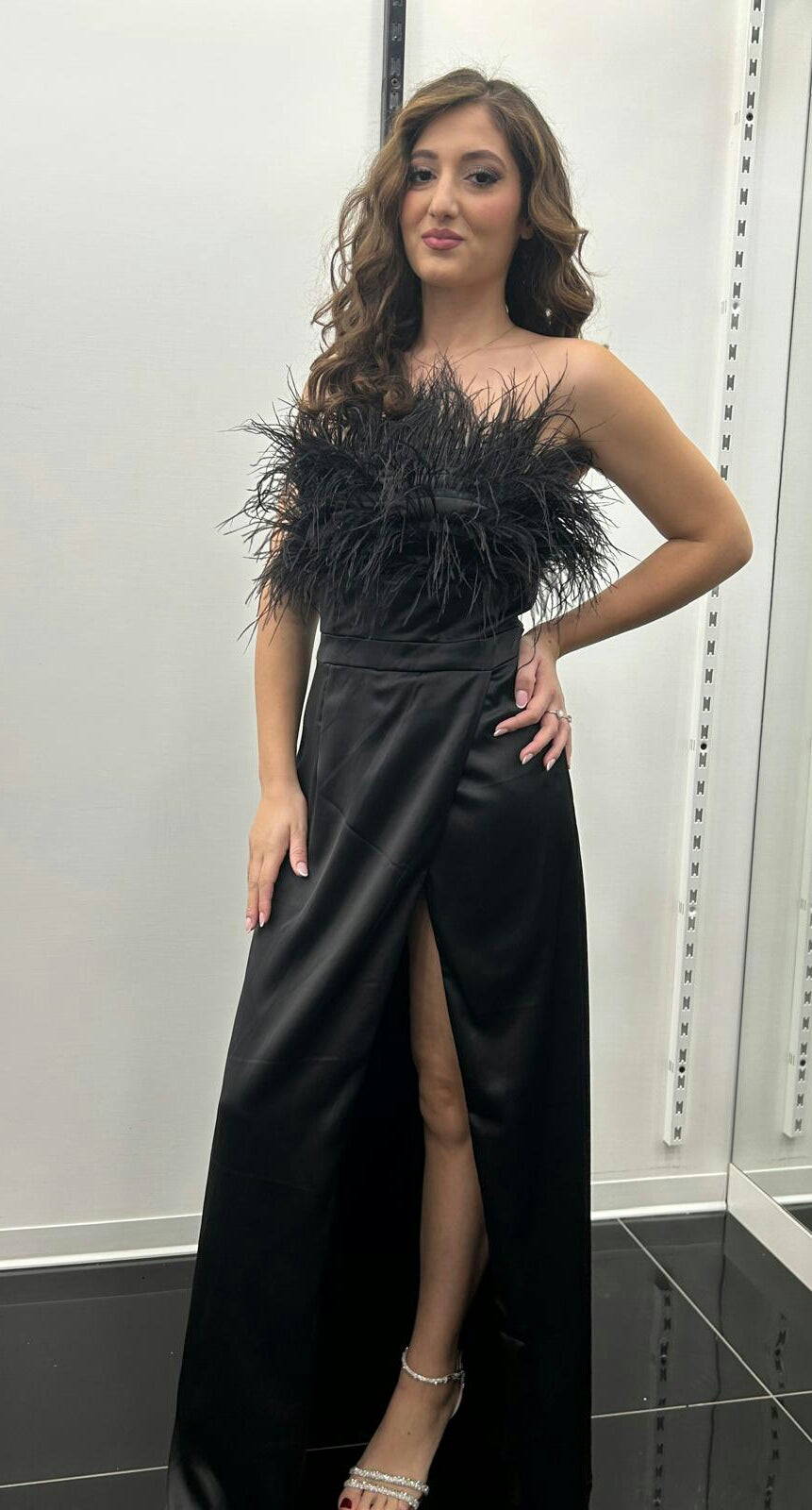 L' ABITO E' REALIZZATO IN RASO, PRESENTA UN CORPETTO SENZA SPALLI NE CON UN'APPLICAZIONE DI PIUME. LA SILHOUETTE E' ADERENTE,CON UNA GONNA LUNGA CHE PRESENTA UNO SPACCO LATERALE.