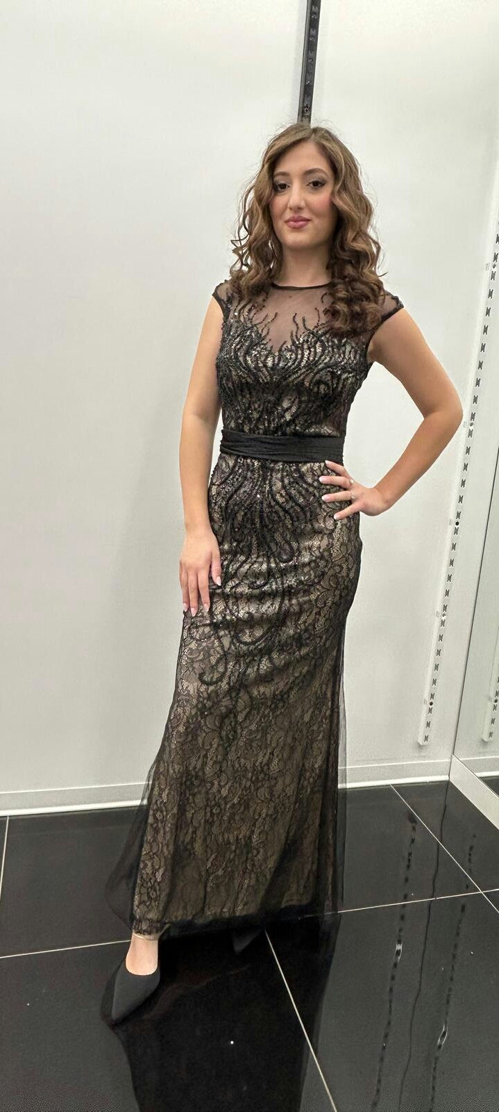 L' ABITO E' PREVALENTEMENTE NERO, REALIZZATO CON UN DELICATO STRATO DI PIZZO. LA FODERA INTERNA CHIARA OFFRE UN CONTRASTO CHE ESALTA I MOTIVI DEL PIZZO. LA VESTIBILITA' E' ADERENTE FINO AI FIANCHI E SI ALLARGA LEGGERMENTE VERSO IL BASSO, CON UNA GONNA LUNGA, CHE DONA UNA SILHOUETTE SLANCIATA.