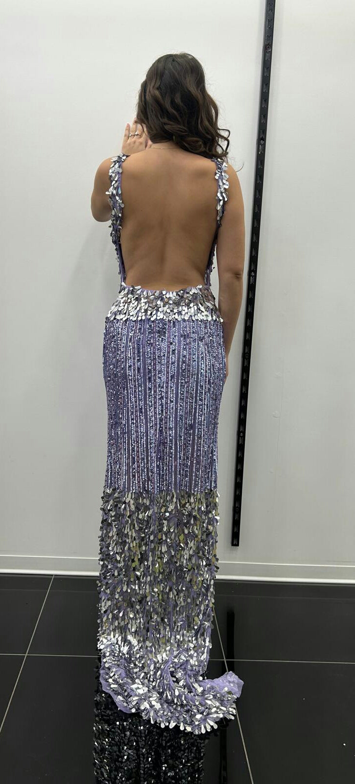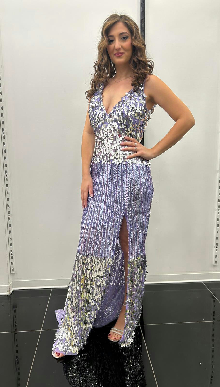 ABITO LUNGO A SIRENA CON SPACCO LATERALE,DECORATO CON PAILLETTES SCINTILLANTI NEI TONI DEL LILLA E ARGENTO. L'ABITO PRESENTA UNO SCOLLO A V E SPALLINE SOTTILI.