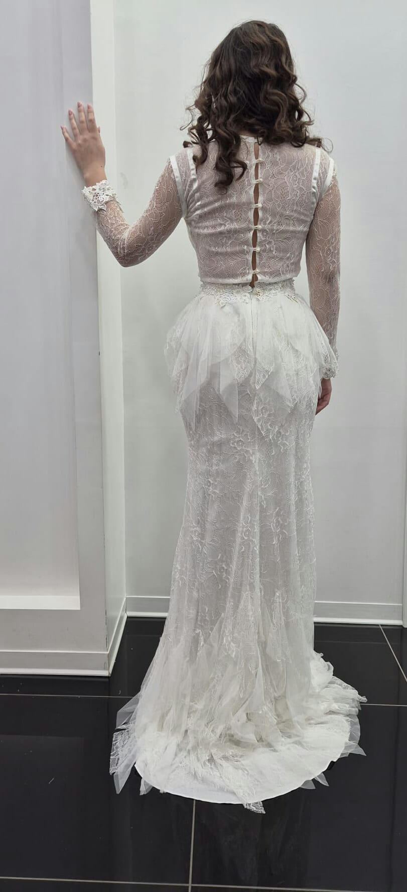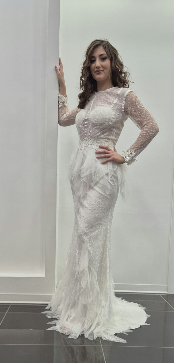 ADERENTE SUL BUSTO,SUI FIANCHI E SULE COSCE, SI ALLARGA A PARTIRE DALLE GINOCCHIA PER CREARE UNA FORMA A SIRENA. TESSUTO DI PIZZO CON APPLICAZIONI DI VOLANT IN TULLE.