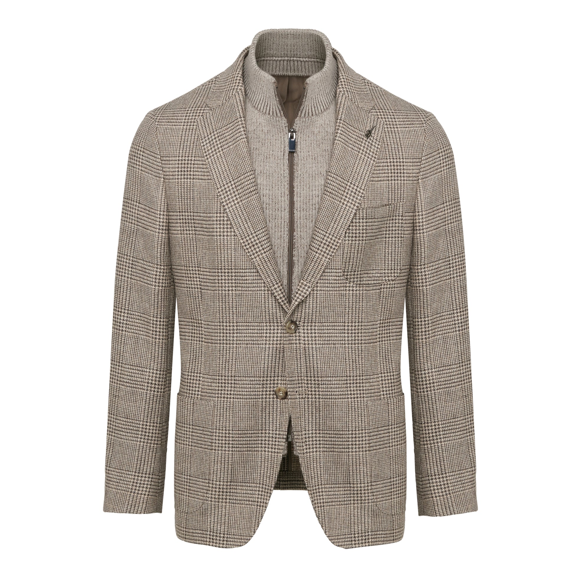 Giacca sfoderata a 2 bottoni, due tasche a toppa e un taschino frontale, spacchi laterali sul retro piu' pettorina estraibile in lana