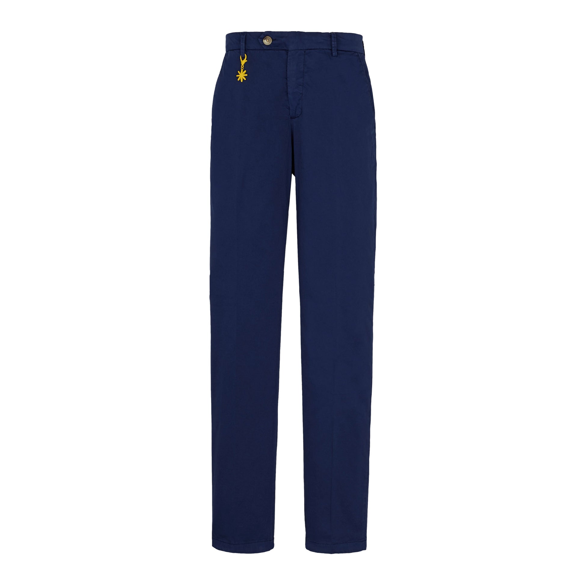 Pantalone slim tinto capo. Due tasche america e taschino portamonete sul davanti, due tasche a filo con bottone sul retro, chiusura con zip e bottone, portachiavi logo staccabile, fondo 18 cm. Gabardina di cotone stretch.