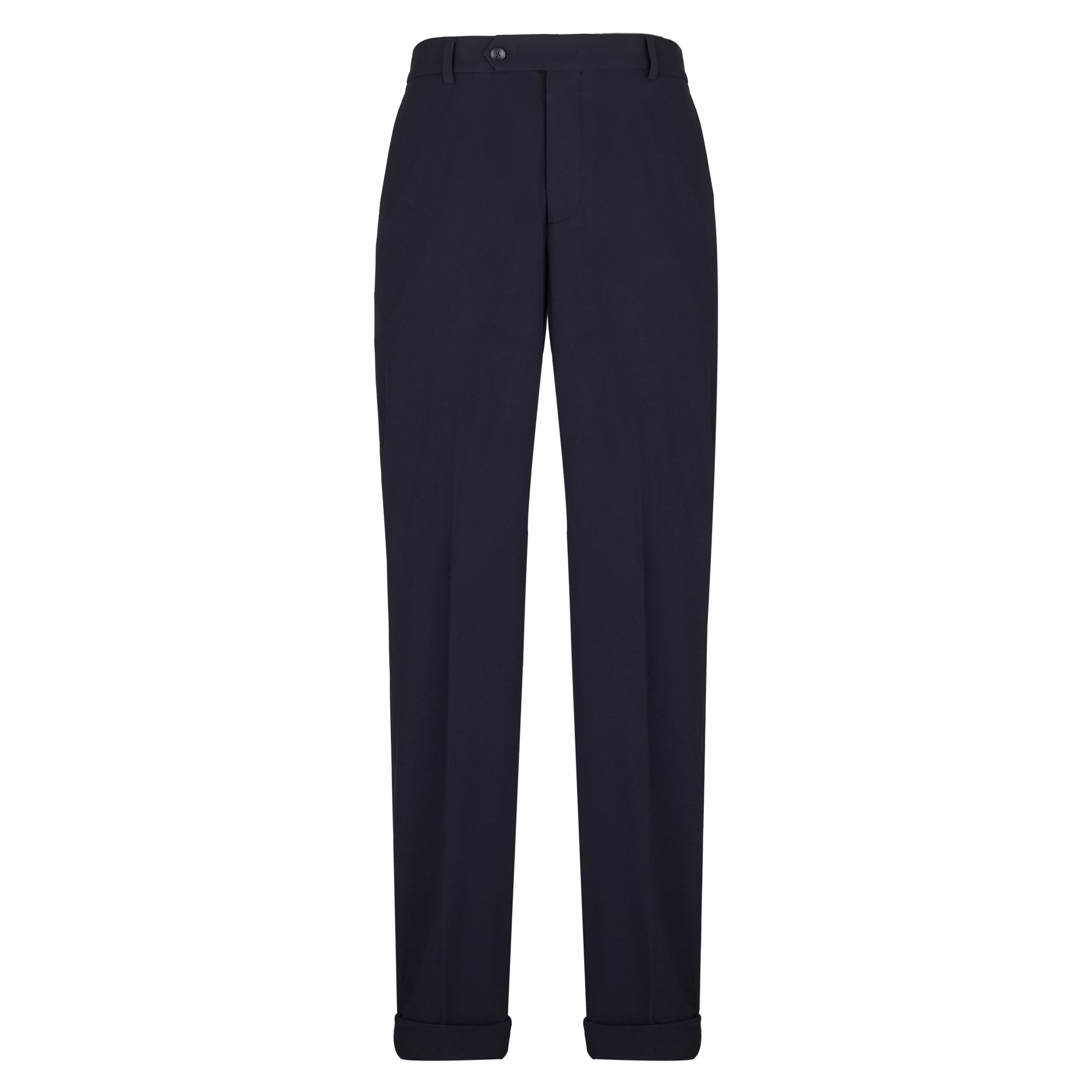 pantalone senza pinces regular fit, due tasche america e un taschino frontali, due tasche a filo con bottone sul retro, passanti in tono in vita, chiusura con zip e bottone, fondo 17,5 cm.
