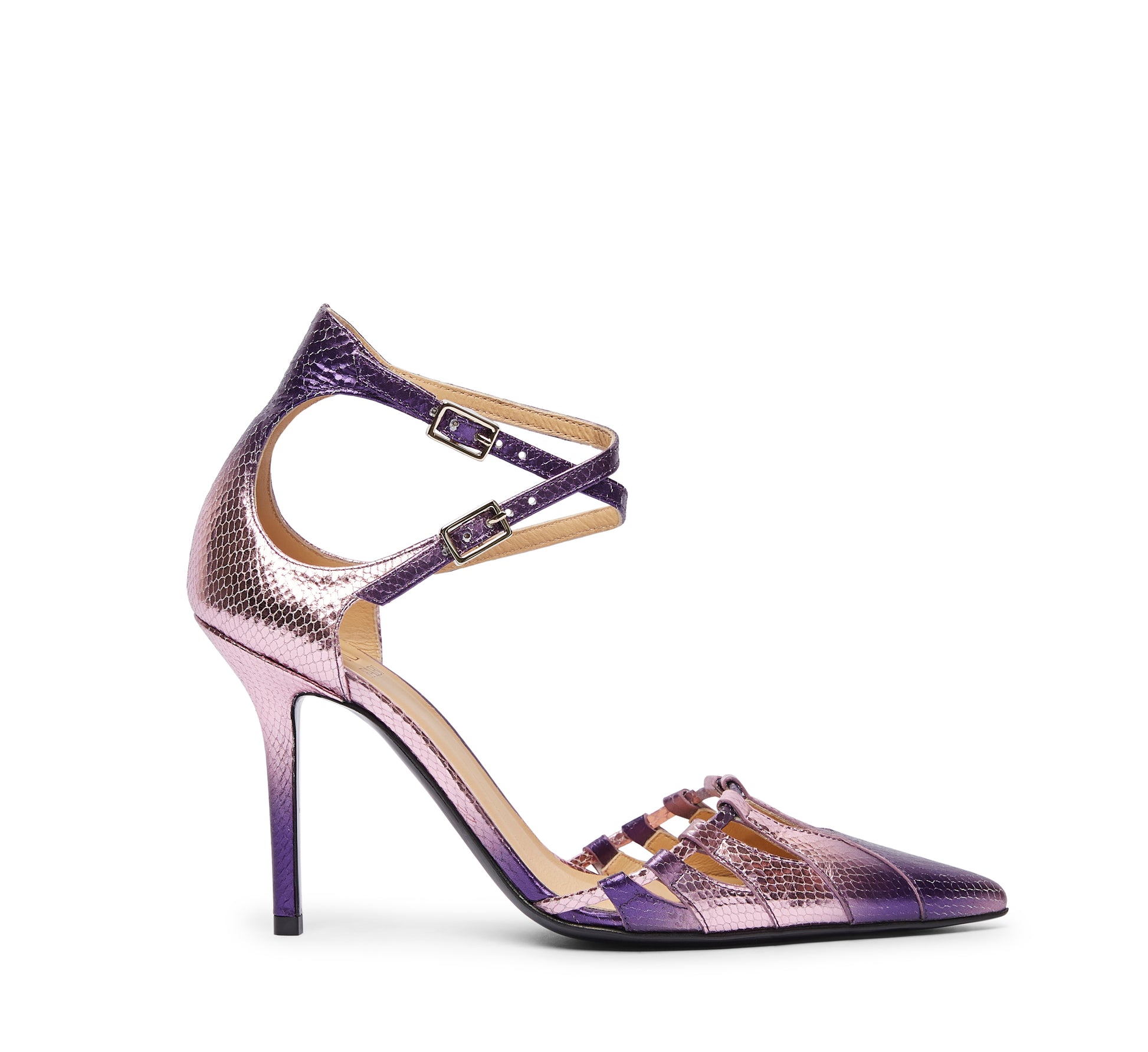 Raffinato e sensuale il nuovo tacco 100 realizzato in vitello stampa rettile con velature di colore dal rosa al viola, con cinturino sulla caviglia.