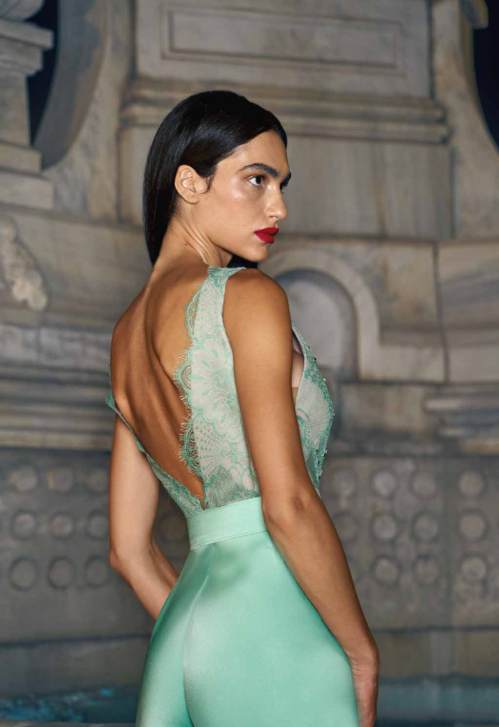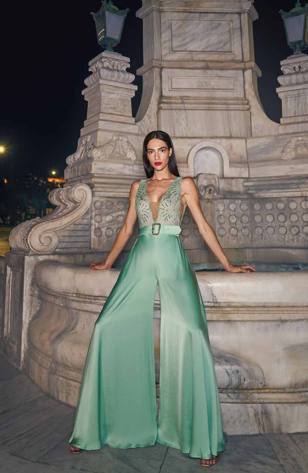 TUTA IN RASO CON PANTALONE PALAZZO, CORPETTO IN PIZZO CON APPLICAZIONI DI STRASS E PAILLETTES, CON CINTURA