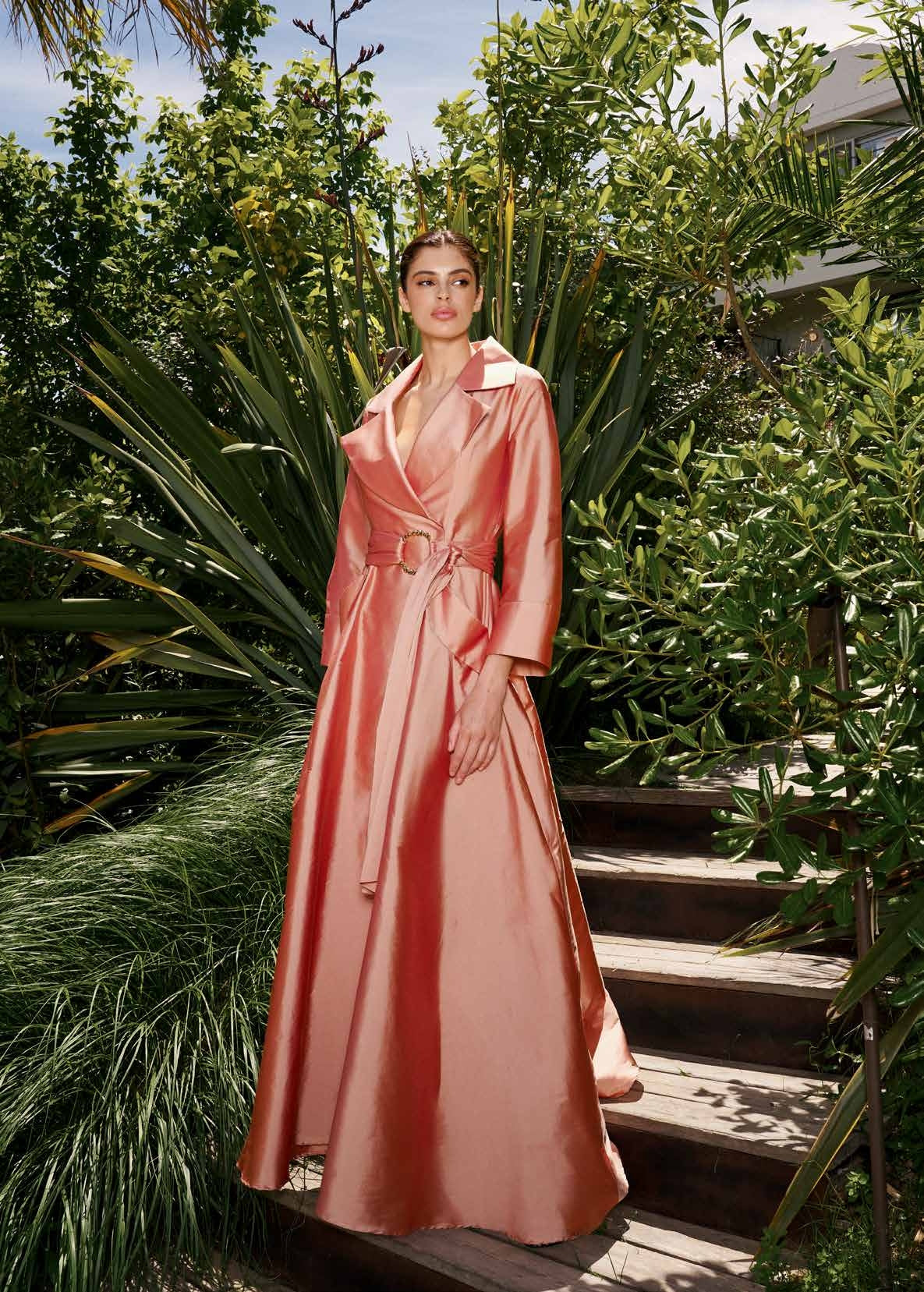 ABITO LUNGO REDINGOTE, MANICHE A TRE QUARTI, CINTURA IN VITA CON CHIUSURA GIOIELLO