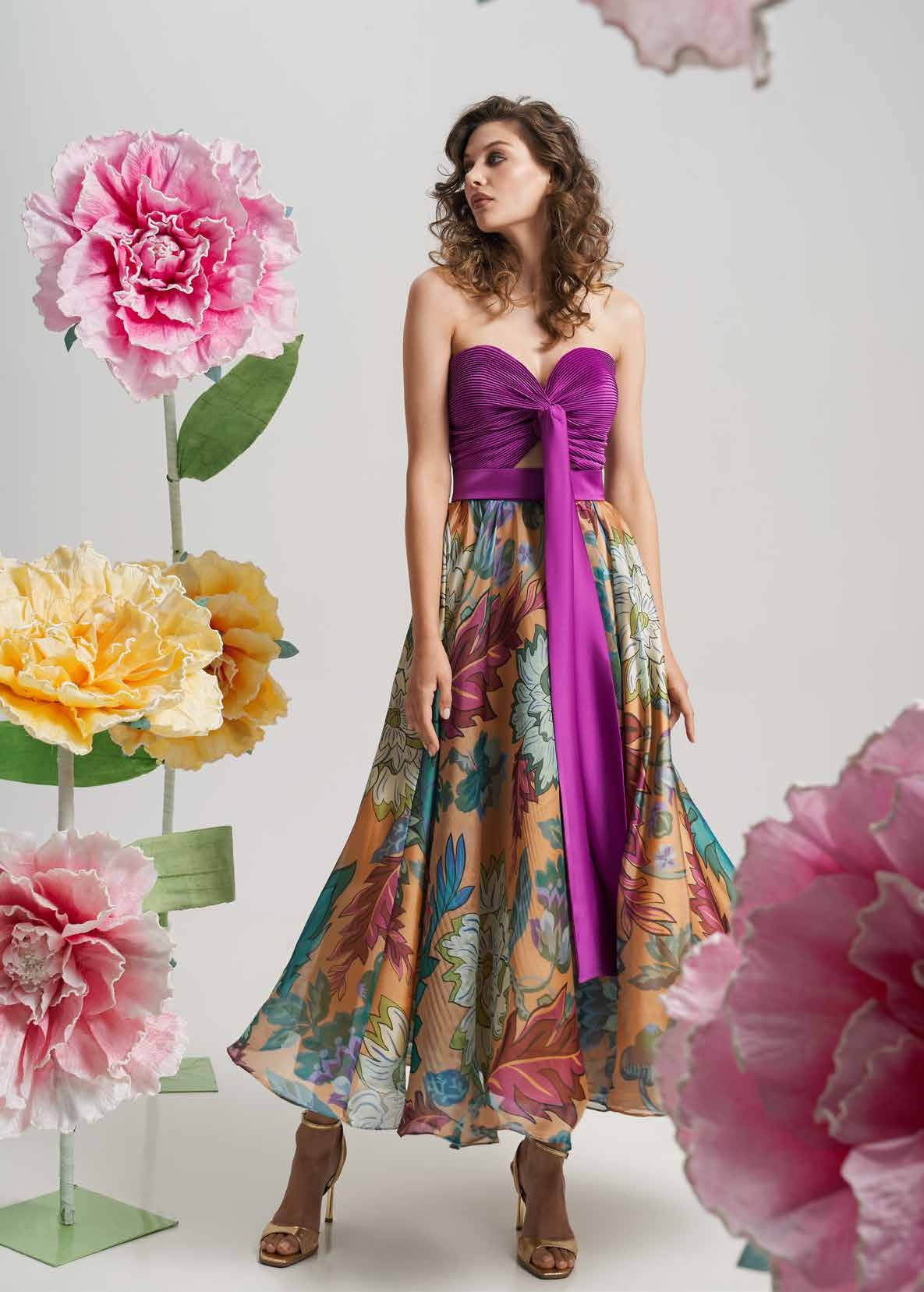 ABITO CON SCOLLATURA A CUORE PLISSETTATO NEI TONI DEL LILLA, GONNA FLOREALE BASE GIALLO OCRA.