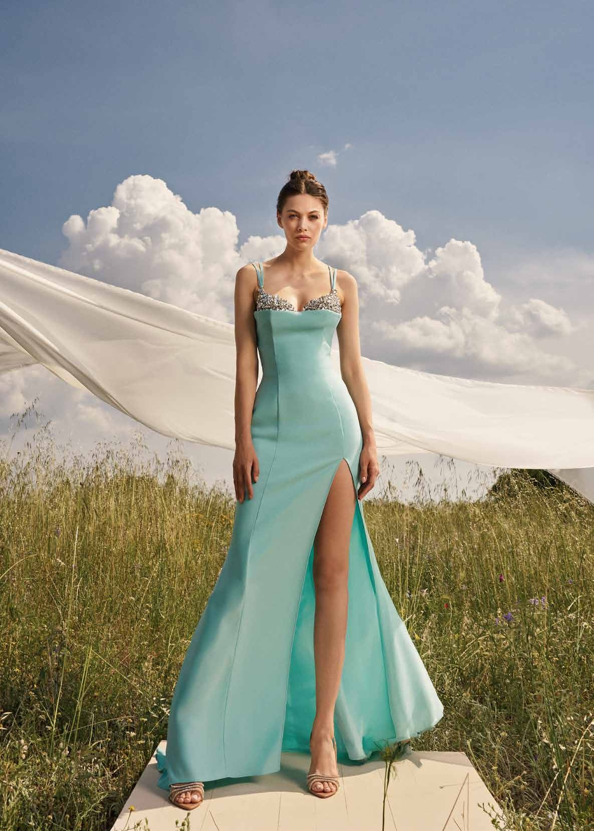 ABITO LUNGO CON UNO SPACCO AUDACE SULLA GAMBA. E' UN ABITO A SIRENA,PRESENTA SPALLINE SOTTILI E UN CORPETTO CON SCOLLO A CUORE DECORATO DA STRASS.