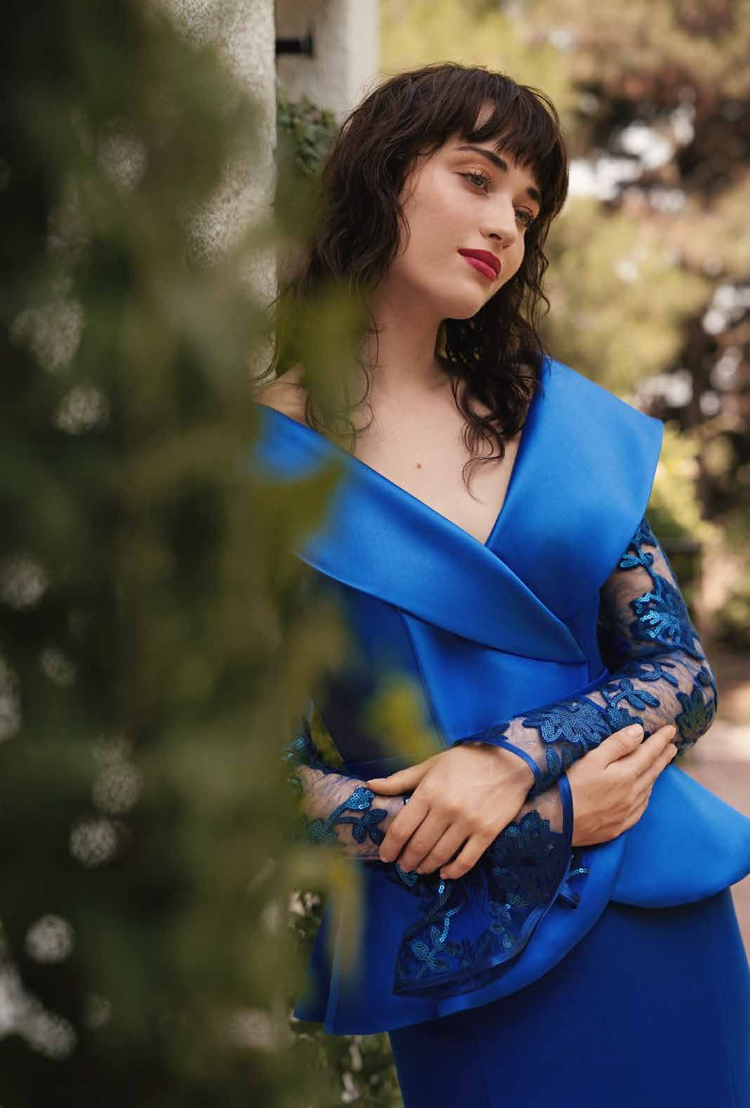 BUSTIER SCOLLATURA OMERALE, MANICHE DI PIZZO, CINTURA IN VITA, GONNELLONE A SIRENA, BUSTIER IN MIKADO E GONNA IN CADY