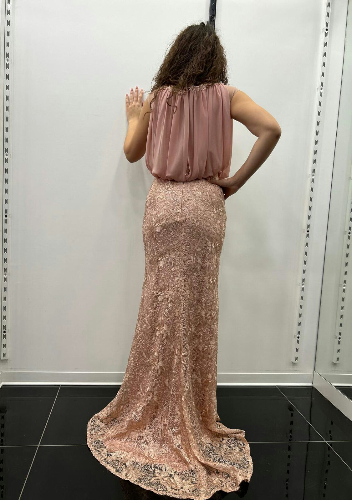 LA PARTE SUPERIORE HA UN TESSUTO LEGGERO CHE CREA VOLUME E MORBIDEZZA, LA PARTE INFERIORE INVECE E' UNA GONNA LUNGA E ADERENTE, A SIRENA, CHE SI ALLARGA LEGGERMENTE VERSO IL BASSO . E' DECORATA CON UN MOTIVO A PIZZO IN TONALITA' ROSA E ORO, CHE LE CONFERISCE UN ASPETTO ELEGANTE E LUCENTE.