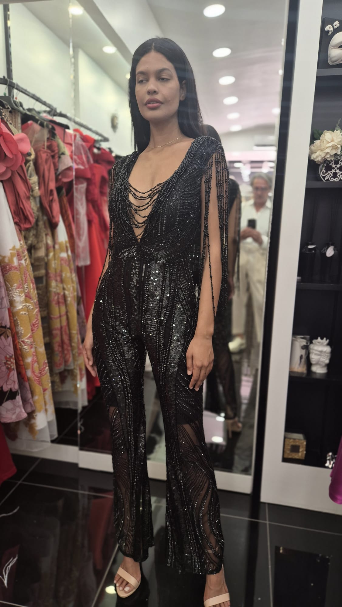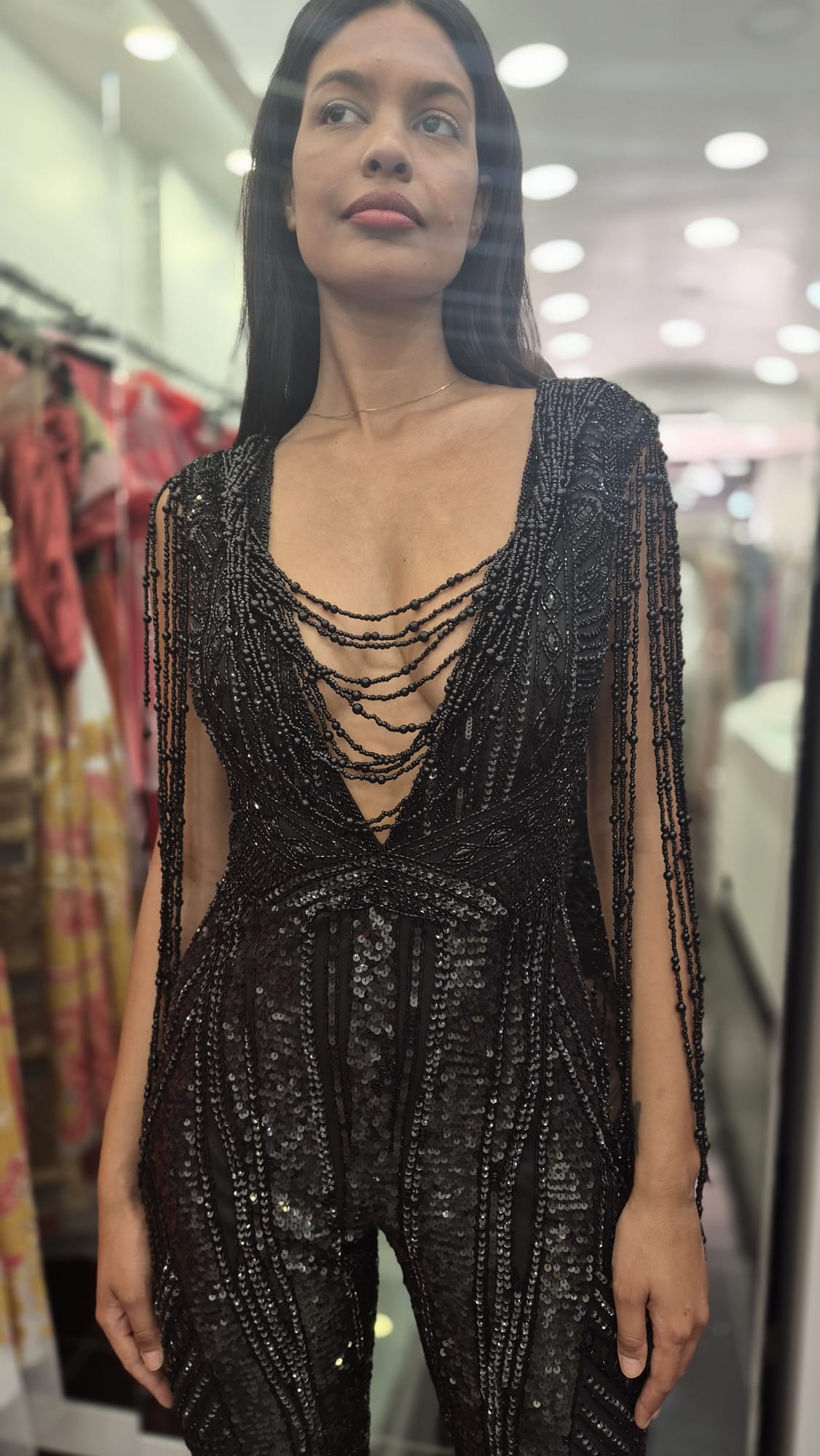 TUTA INTERAMENTE RICOPERTA DA PAILLETTES E CORALLI , CON CASCATE DI PERLINE SUL SENO CHE VANNO A COPRIRE LA PROFONDA SCOLLATURA E FILI DI PERLINE CHE VANNO A COPRIRE SULLE BRACCIA