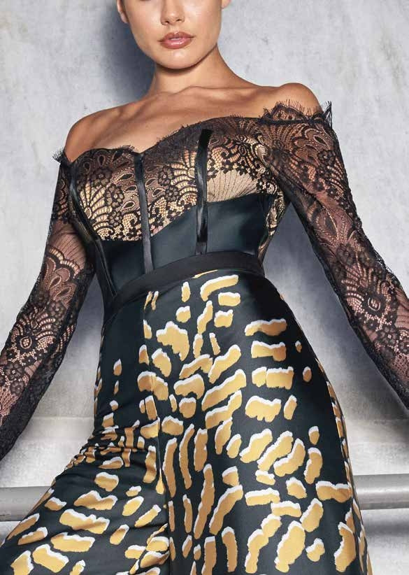 TUTA CON CORPETTO STECCATO MANICHE LUNGHE DI PIZZO, PANTALONE PALAZZO CON FANTASIA ANIMALIER, CON CINTURA IN VITA