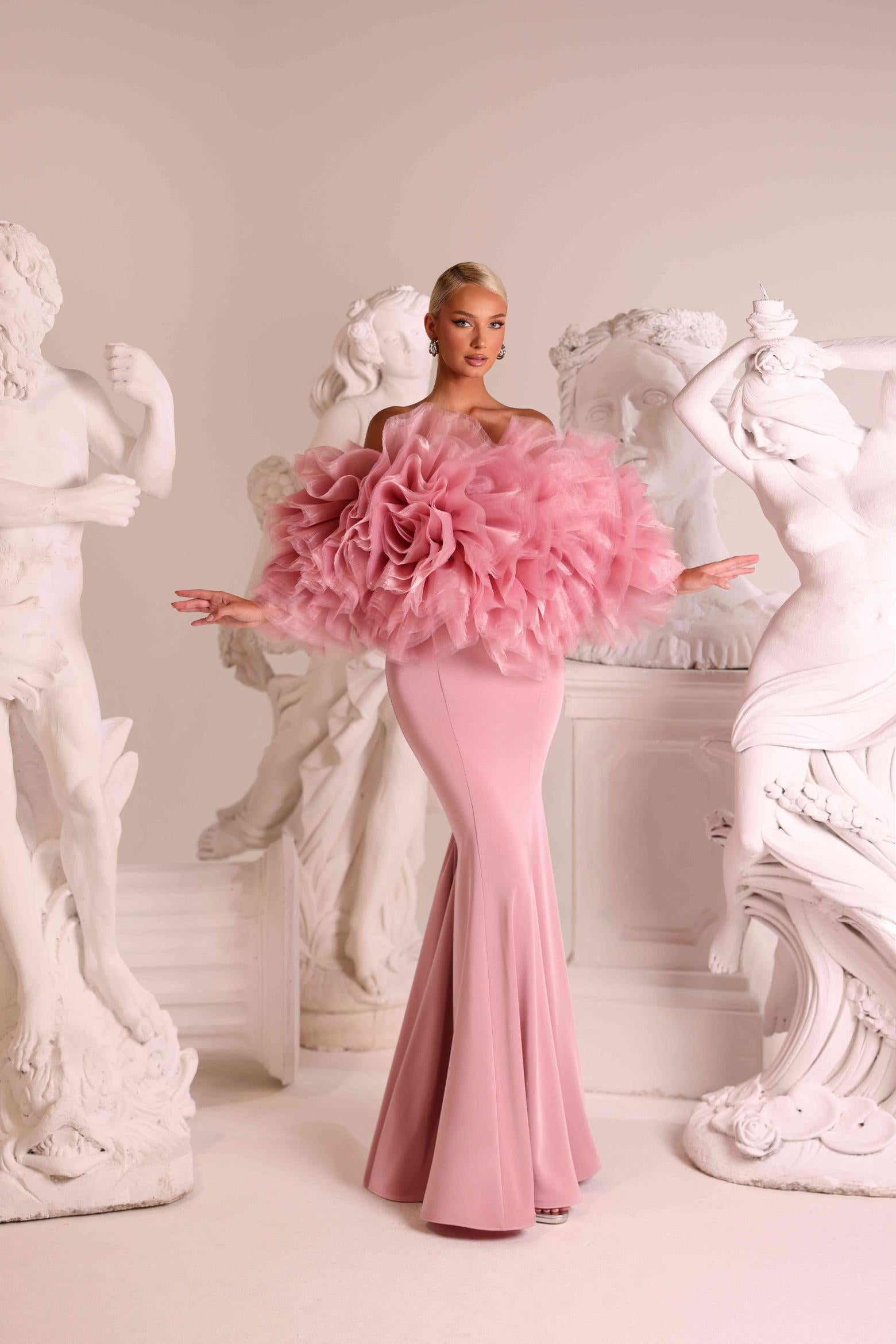 ABITO SEMPLICE LUNGO TINTA UNITA CON COPRISPALLE DI TULLE EFFETTO FIORE