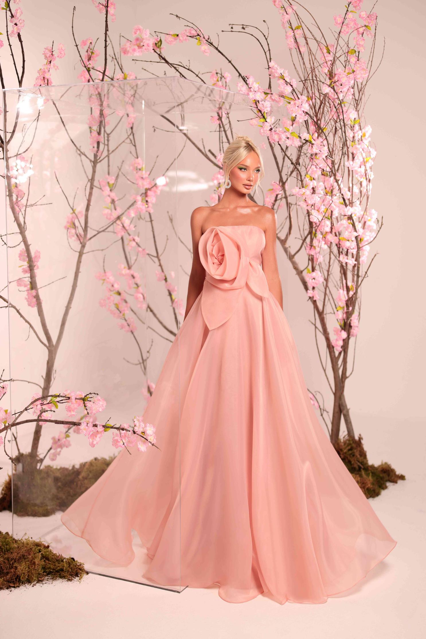 L'ABITO CARATTERIZZATO DA UNO STILE ROMANTICO E RAFFINATO. ABITO SENZA SPALLINE CON UN VISTOSO E SCENOGRAFICO DETTAGLIO FLOREALE A FORMA DI ROSA APPLICATO SULLA PARTE ANTERIORE DEL BUSTO. GONNA AMPIA E VAPOROSA.