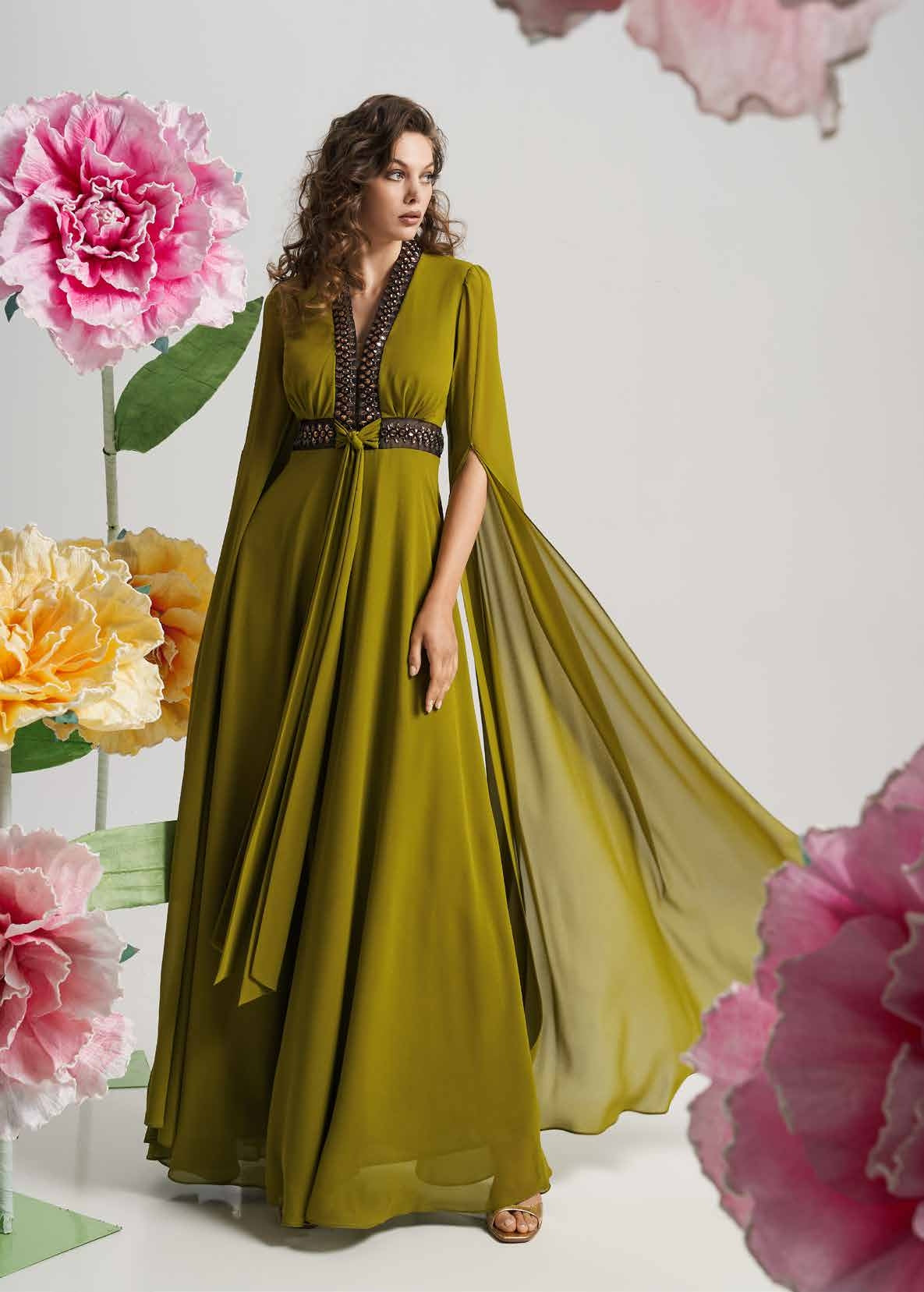 ABITO LUNGO IN CHIFFON VERDE. L' ABITO PRESENTA SCOLLO A V E MANICHE A SBUFFO CHE CREANO UN EFFETTO MANTELLO. APPLICAZIONI SULLA VITA E SULLO SCOLLO.