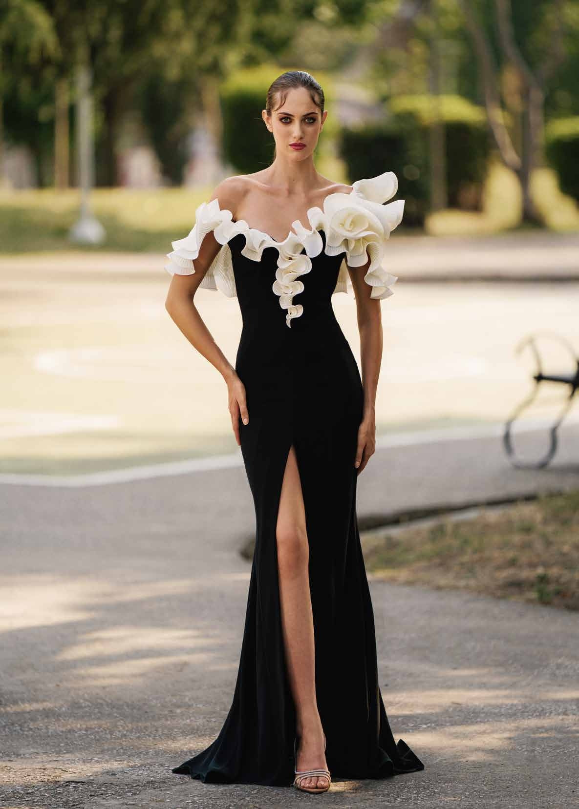 ABITO LUNGO IN CADY A SIRENA, CON TESSUTO PLISSETTATO SULLO SCOLLO IN BIANCO DA CONTRASTO.