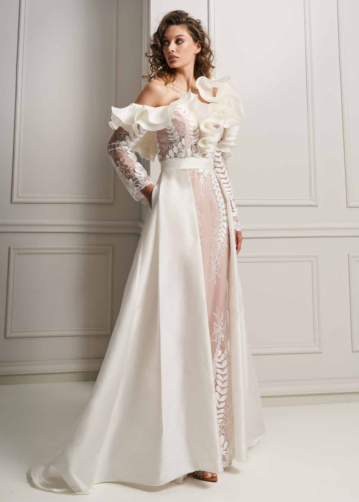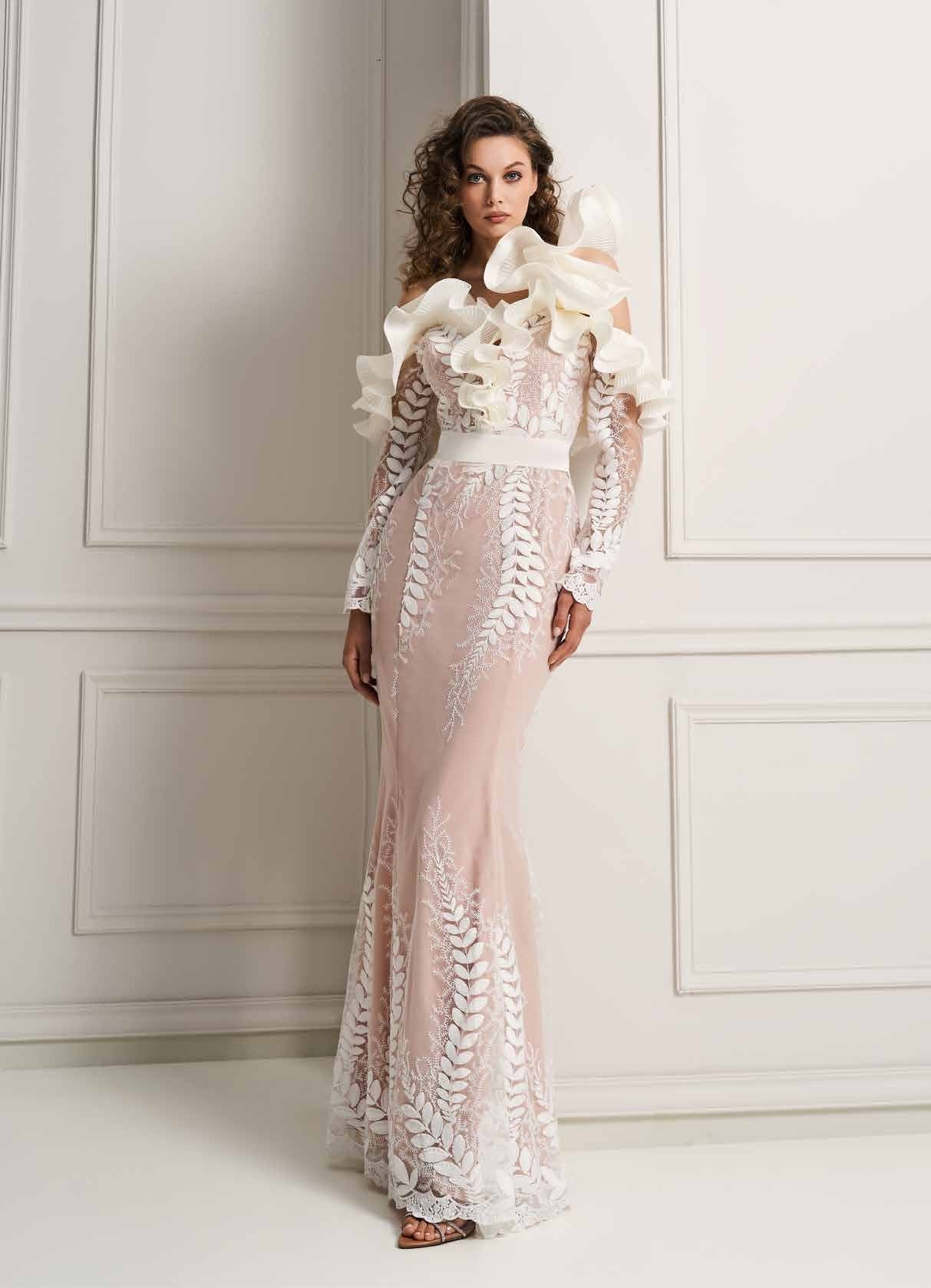 ABITO LUNGO CON RUGE SULLO SCOLLO, GONNELLONE IN MIKADO. L 'ABITO HA TRASPAENZE E APPLICAZIONI FLOREALI