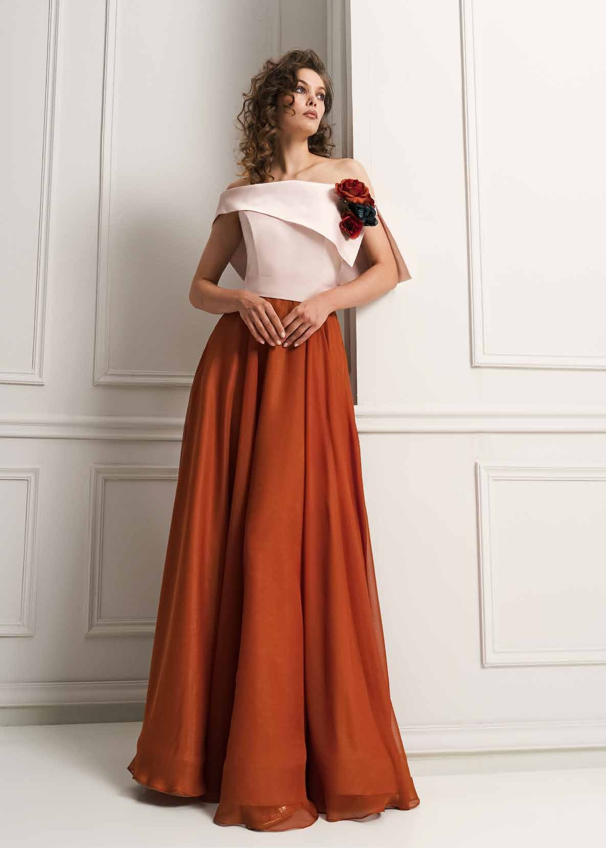 ABITO LUNGO BICOLORE, CORPETTO TONI DELL' AVORIO CON CINTURINO, APPLICAZIONE FLOREALE, GONNA NEL COLORE MATTONE