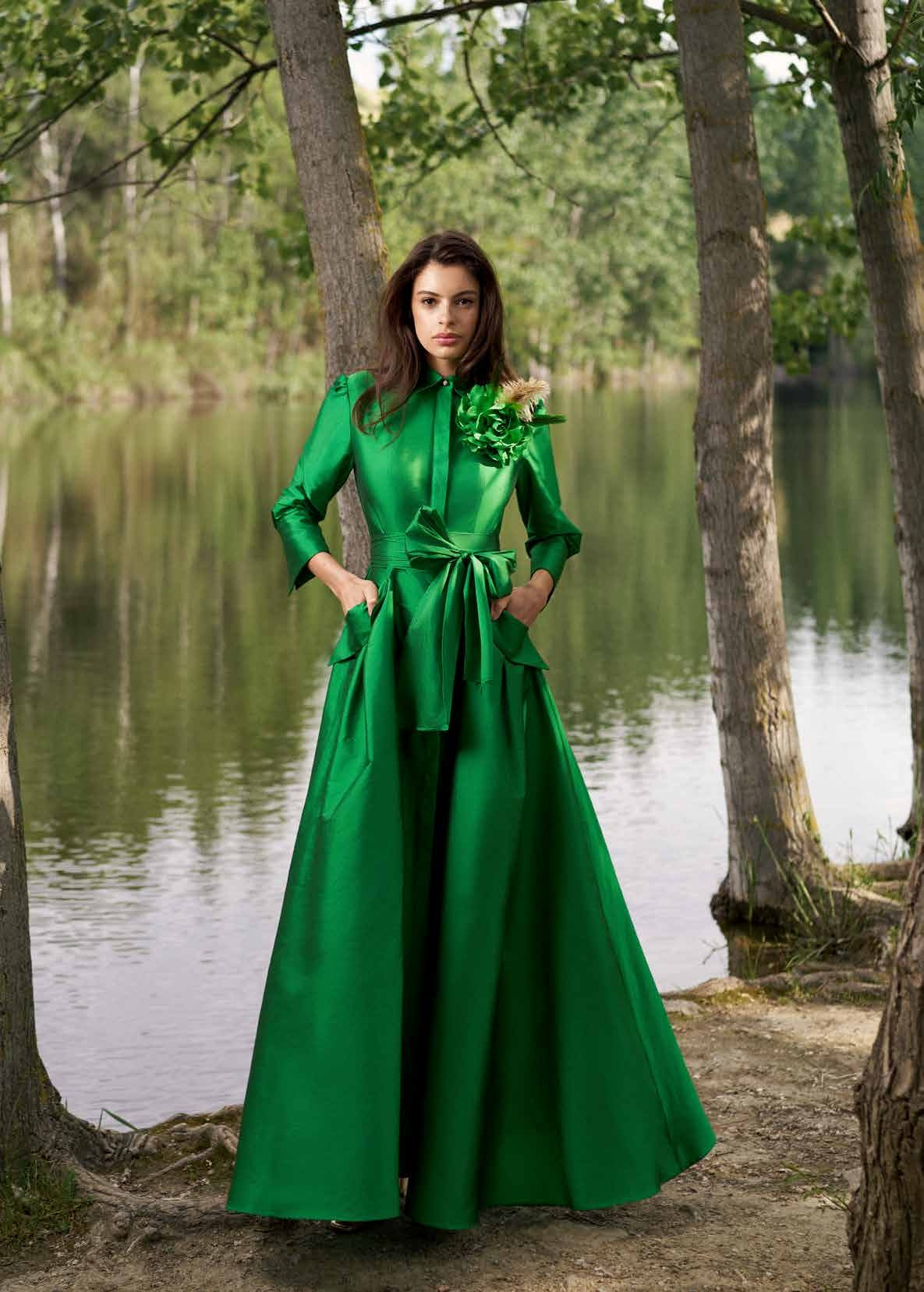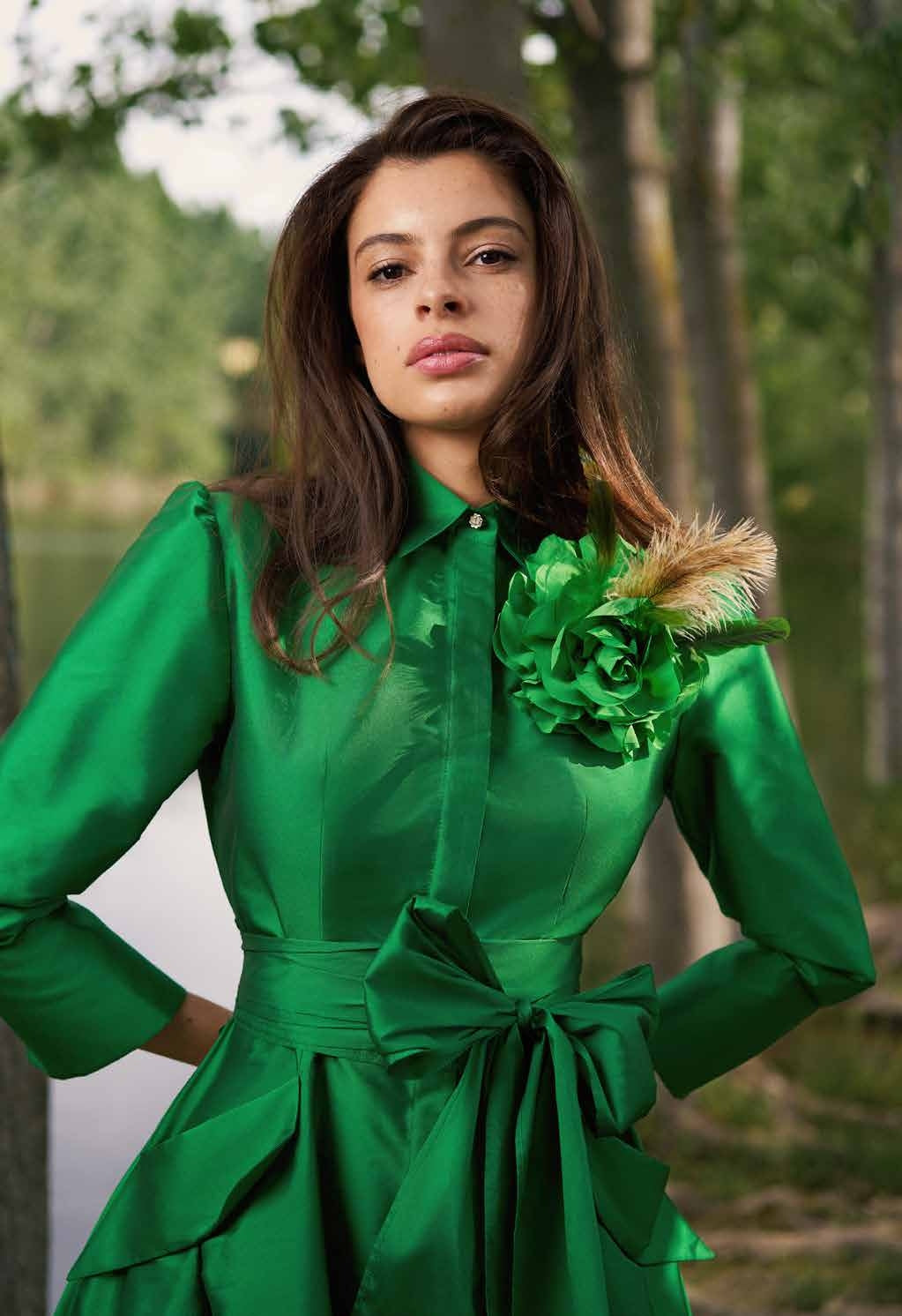 ABITO LUNGO EFFETTO CAMICIA, MANICHE A TRE QUARTI, BOTTONCINI GIOIELLO, APPLICAZIONE FLOREALE, CINTURA IN VITA, TASCONI SSULLA GONNA.