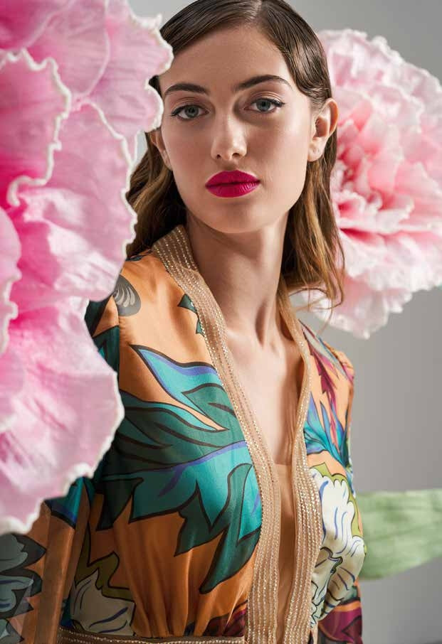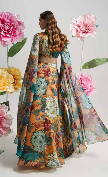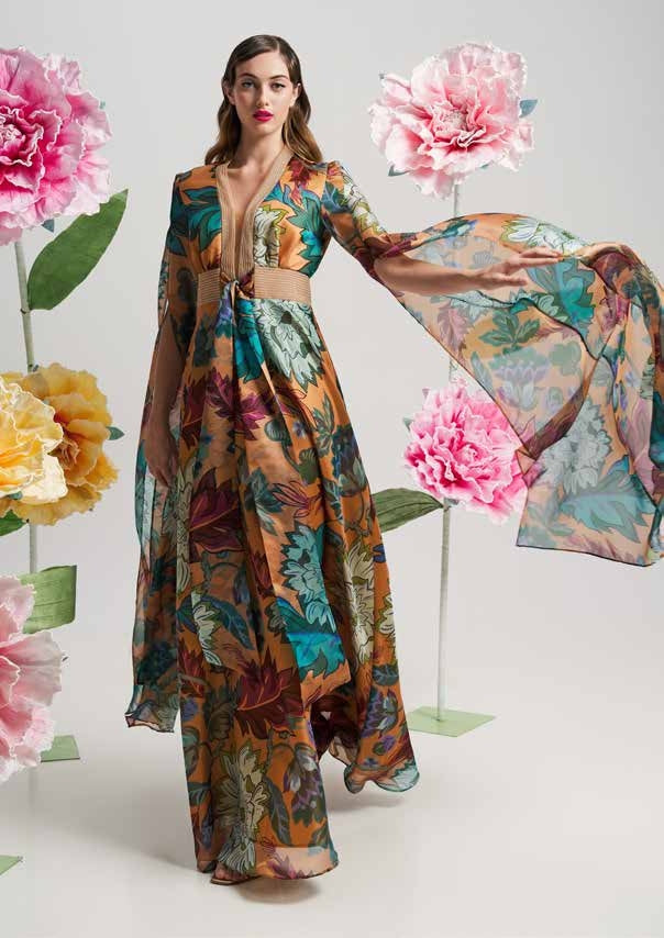 ABITO LUNGO IN CHIFFON A FANTASIA FLOREALE, MANICHE LUNGHE, CINTURINO E SCOLLO CON APPLICAZIONI DI STRASS