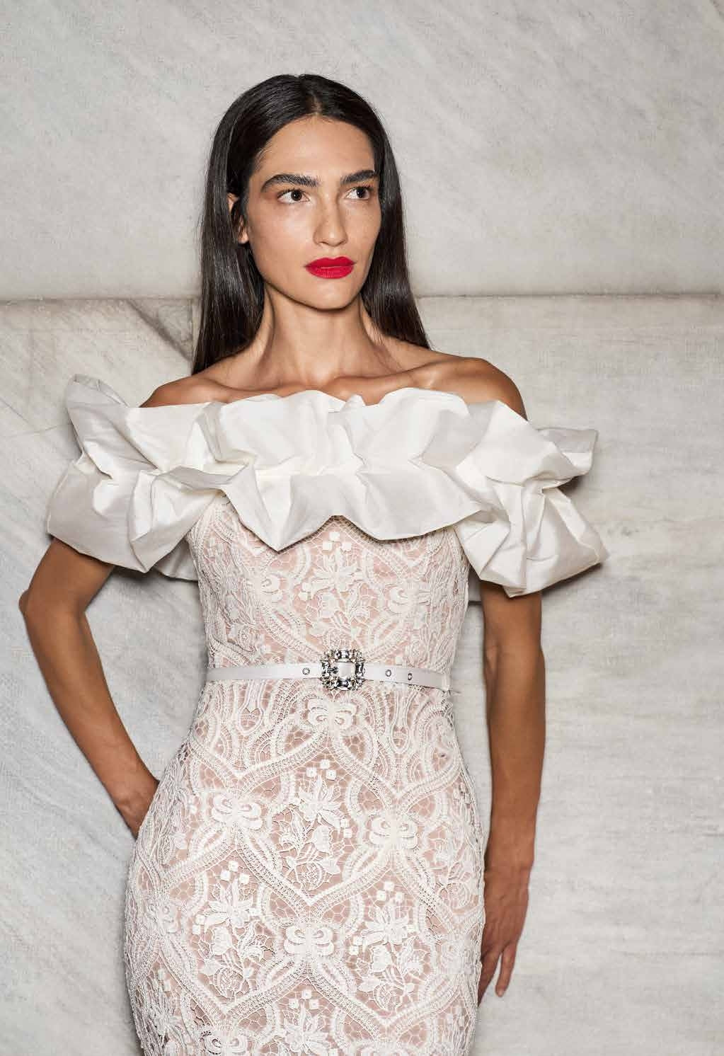 ABITO MIDY IN PIZZO, CON SCOLLATURA OMERALE, SPALLINE SOTTILI, VOLANT SULLO SCOLLO E SULL ORLO. CINTURINO IN VITA CON CHIUSURA GIOIELLO