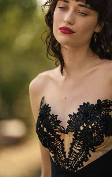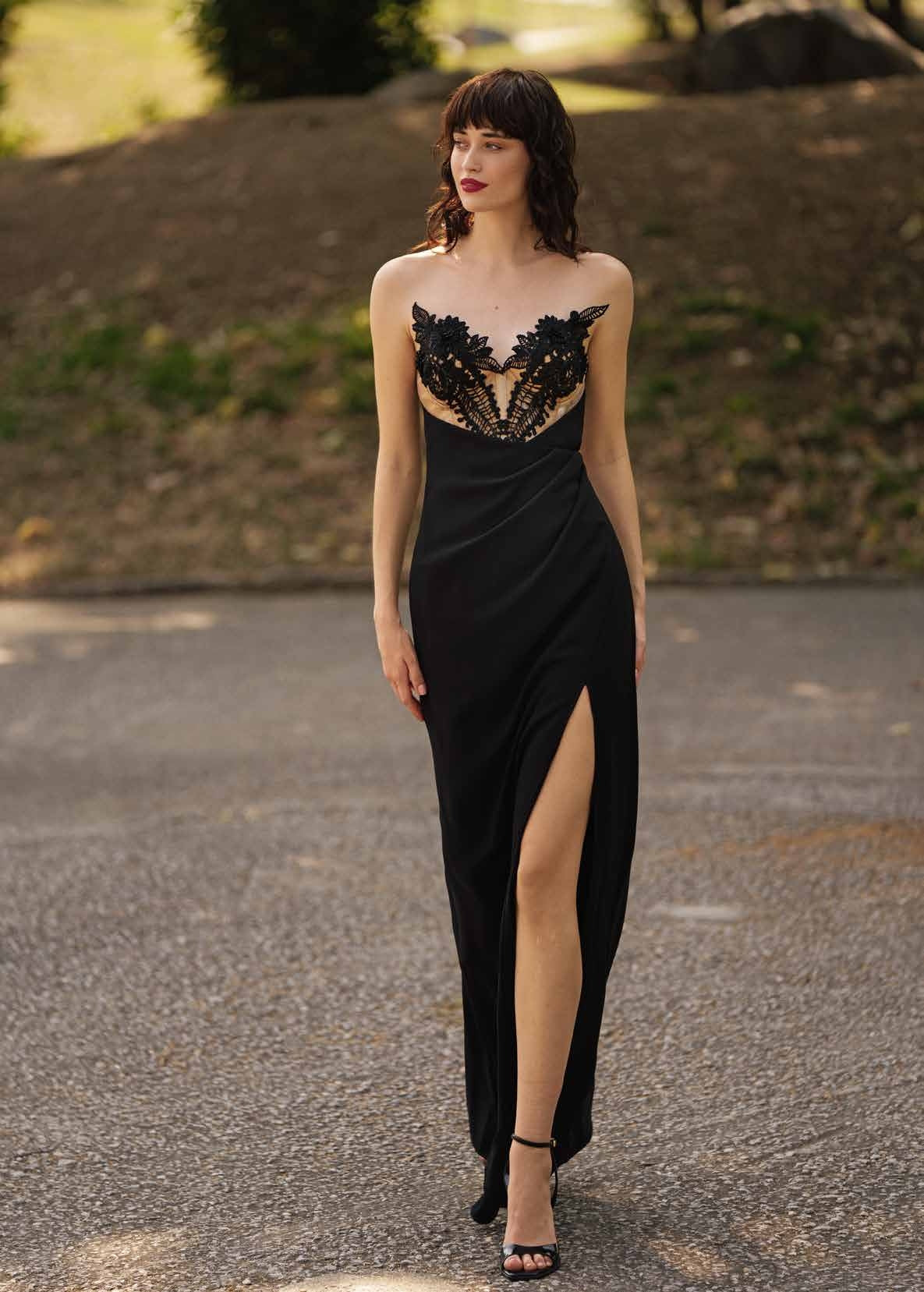 ABITO LUNGO NERO CON CORPETTO CON BASE NUDE, CON APPLICAZIONI IN PIZZO