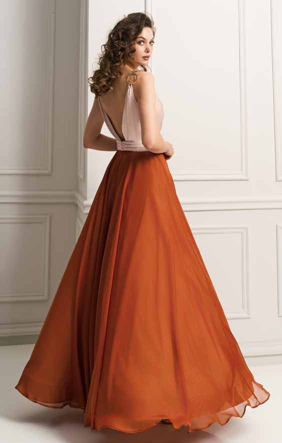 ABITO LUNGO IN CHIFFON, LA PARTE SUPERIORE HA DELLE AGGRAPPATURE, BRATELLE GIOIELLO ED E' DI UN ROSA TENUE, LA GONNA E' AMPIA ED E' NEL COLORE BRUCIATO. CINTURINO IN VITA CON CHIUSURA GIOIELLO.