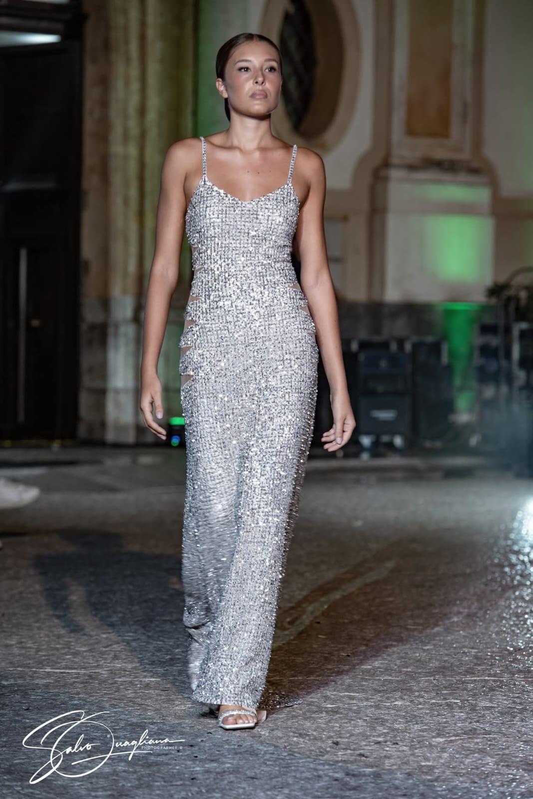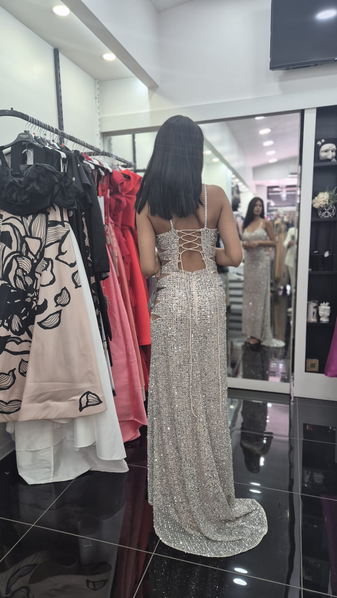ABITO LUNGO TEMPESTATO DI PAILLETTES CON STRAPPI LATERALI DI TULLE TRASPARTENTE