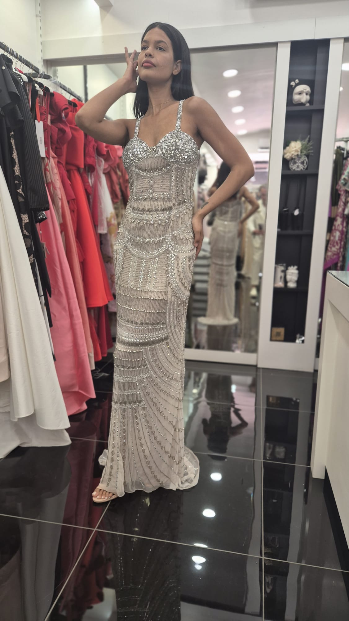 ABITO LUNGO, TEMPESTATO DA PERLINE E CORALLI, NEI TONI DEL BRONZO E ARGENTO, CORPETTO CON APPLICAZIONI DI SWAROSKY.