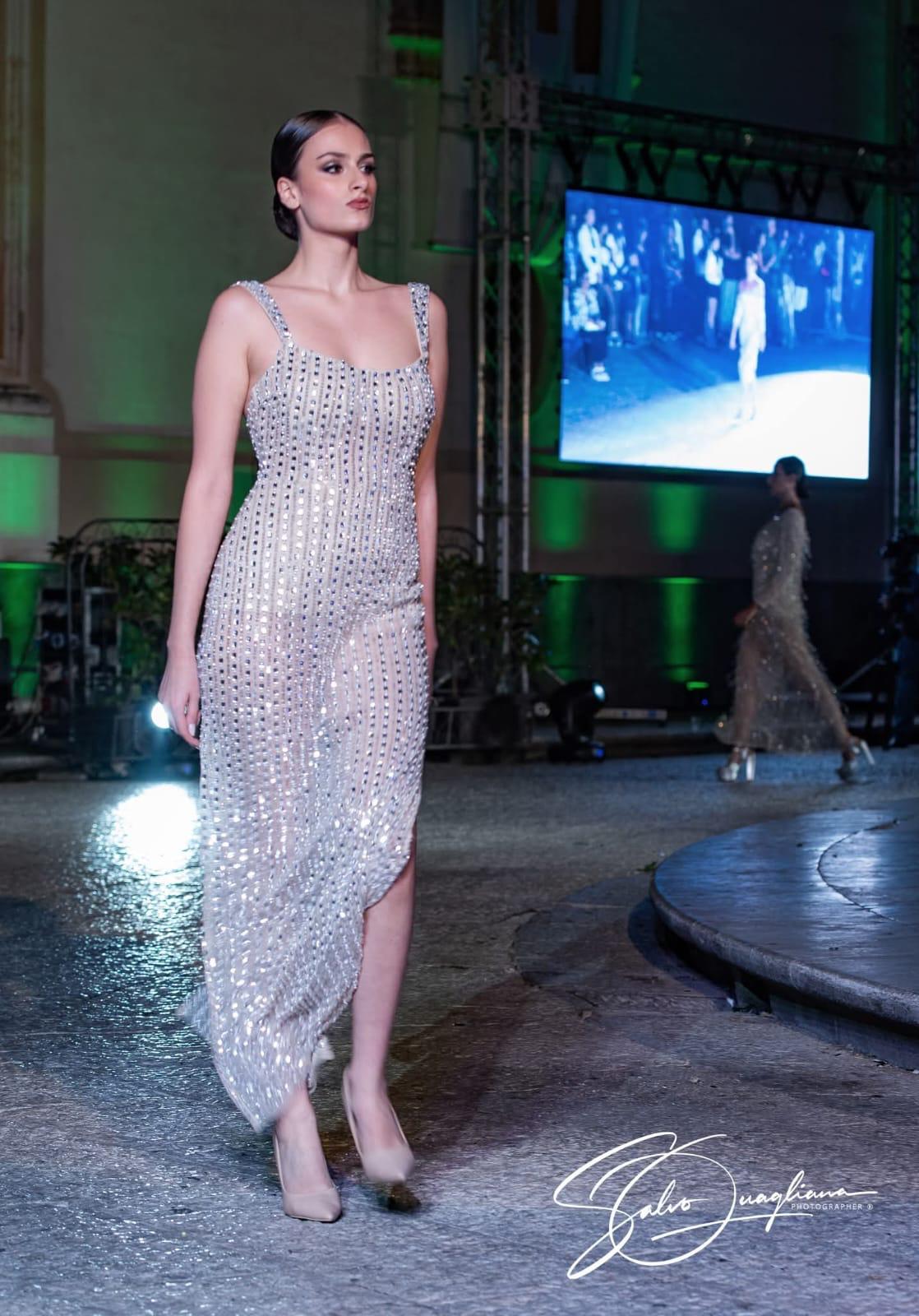 L' ABITO E' RICOPERTO DA UNA FITTA APPLICAZIONE DI PAILLETTES E PERLINE LUCCICANTI, CHE CREANO UN EFFETTO GLITTERATO E LUMINOSO. PRESENTA UNO SCOLLO A CUORE E SPALLINE LARGHE DECORATE CON STRASS, CHE VALORIZZANO LA SILHOUETTE. PRESENTA 2 SPACCHI LATERALI.