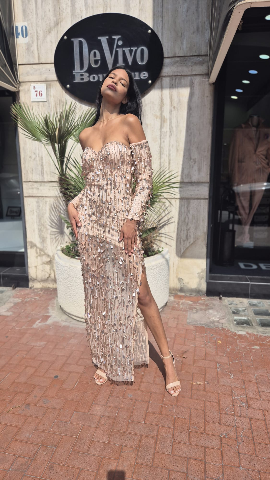ABITO LUNGO DA SERA, DECORATO CON PAILLETTES, IDEALE PER EVENTI FORMALI O FESTE ELEGANTI. L'ABITO HA UN TAGLIO ADERENTE A SIRENA CON UNO SPACCO LATERALE SULLA COSCIA. PèRESENTA UNO SCOLLO A CUORE E SPALLE SCOPERTE CON MANICHE LUNGHE ATTILLATE REMUOVIBILI. E' REALIZZATO CON UN TESSUTO TEMPESTATO DA PAILLETTESA SCINTILLANTI.