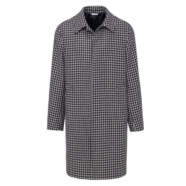 Cappotto foderato, chiusura con bottoni a scomparsa, due tasche frontali, spacco centrale sul retro, finiture con impunture. Damier in misto lana