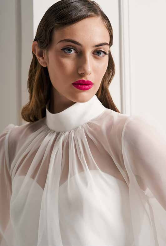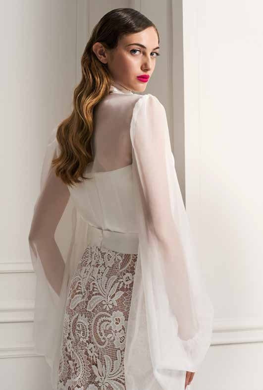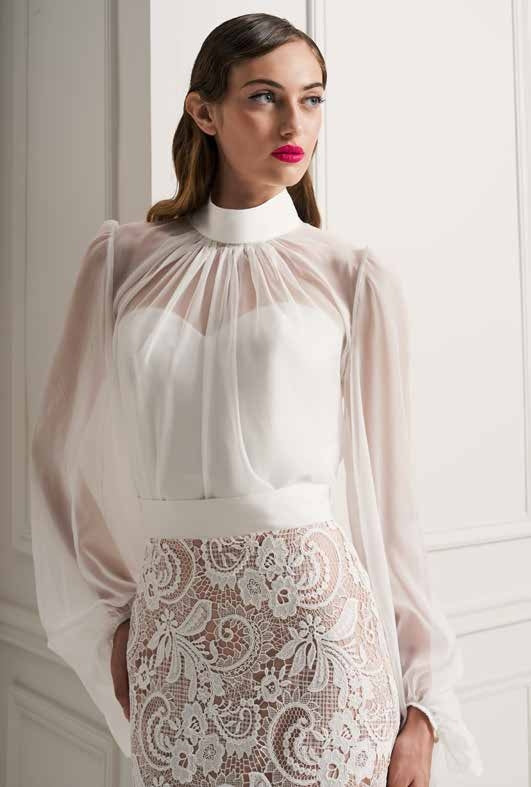 COMPLETO CON GONNA STRETTA IN PIZZO, CORPETTO CON SCOLLATURA A CUORE E MAGLIA IN CHIFFON CON MANICHE A SBUFFO E COLLARINO.