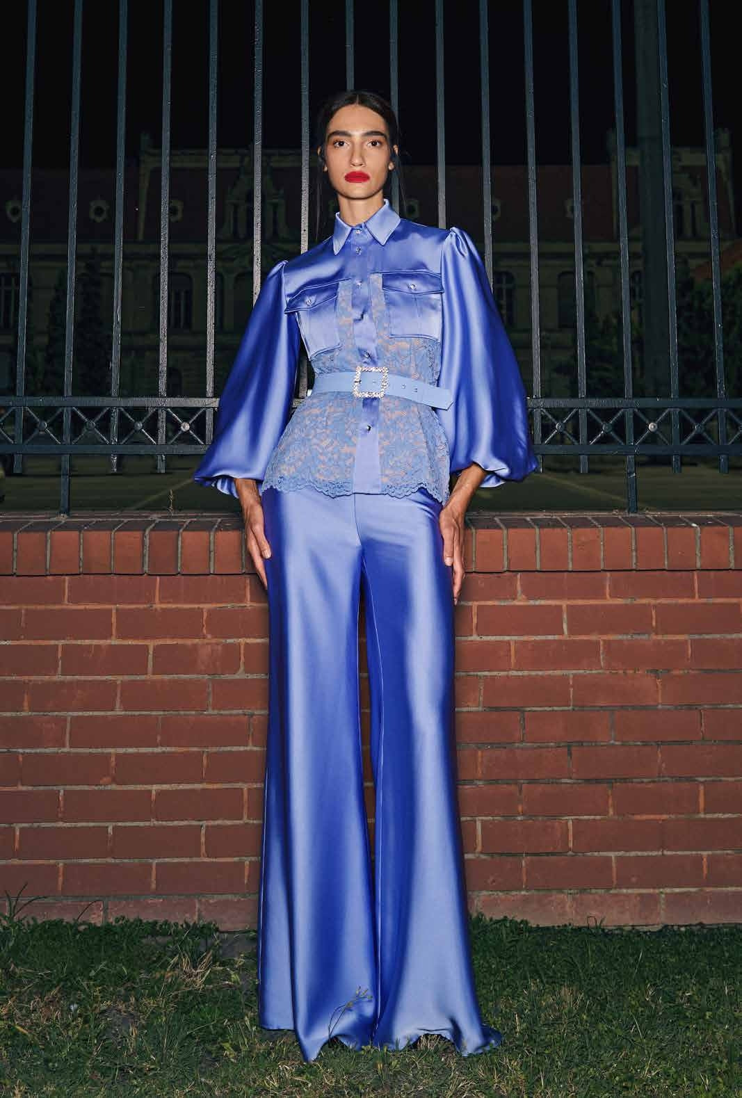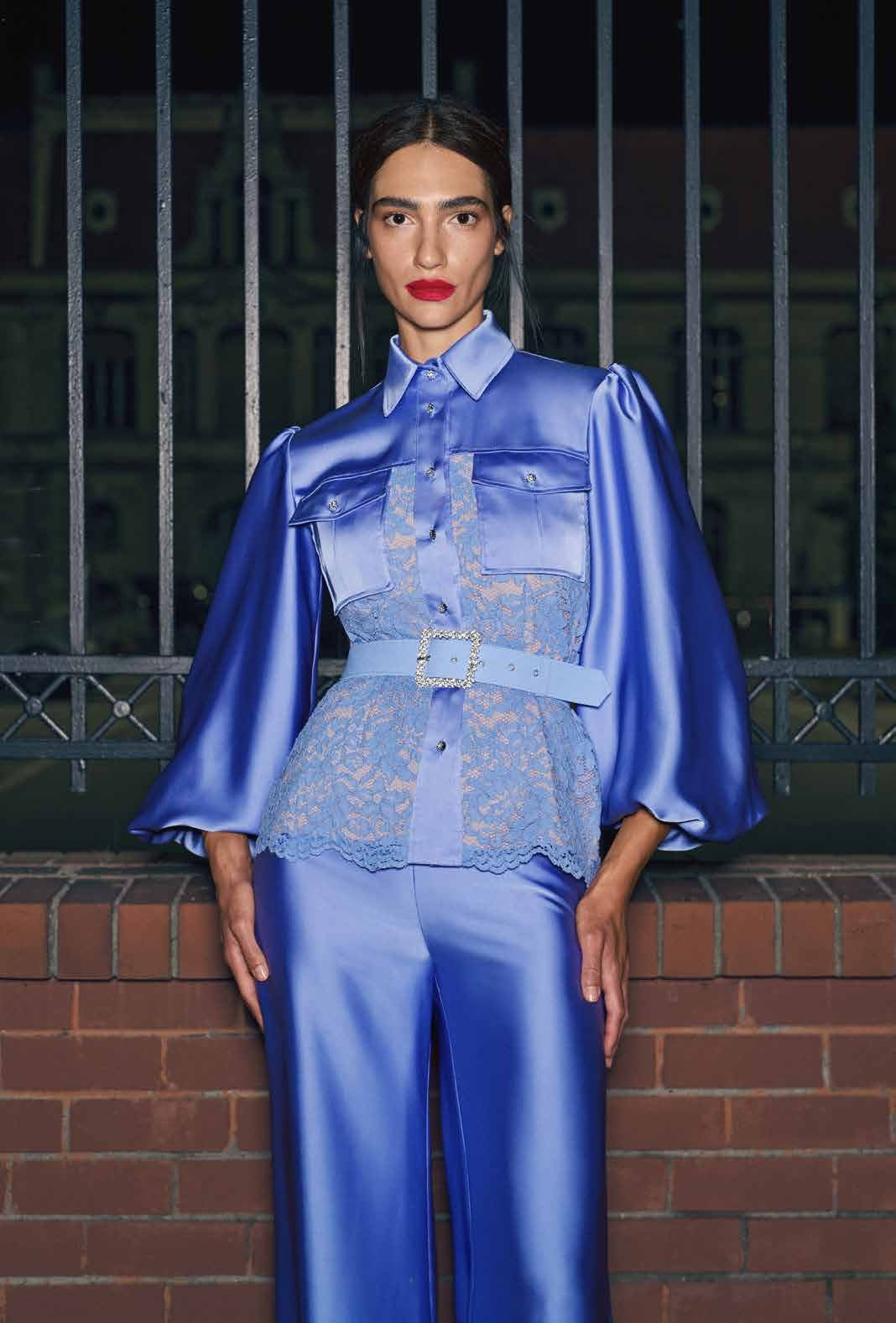 COMPLETO PANTALONE, CAMICIA IN RASO CON PIZZO, PANTALONE PALAZZO. CINTURINO IN VITA CON CHIUSURA GIOIELLO