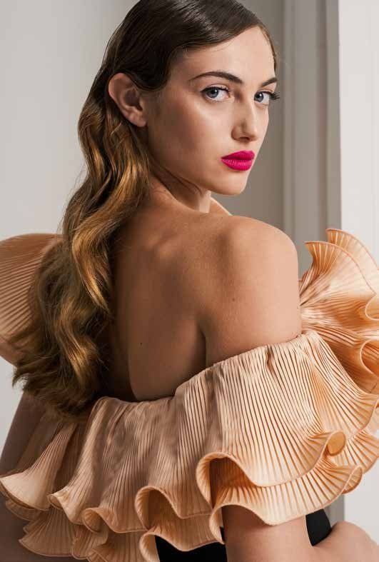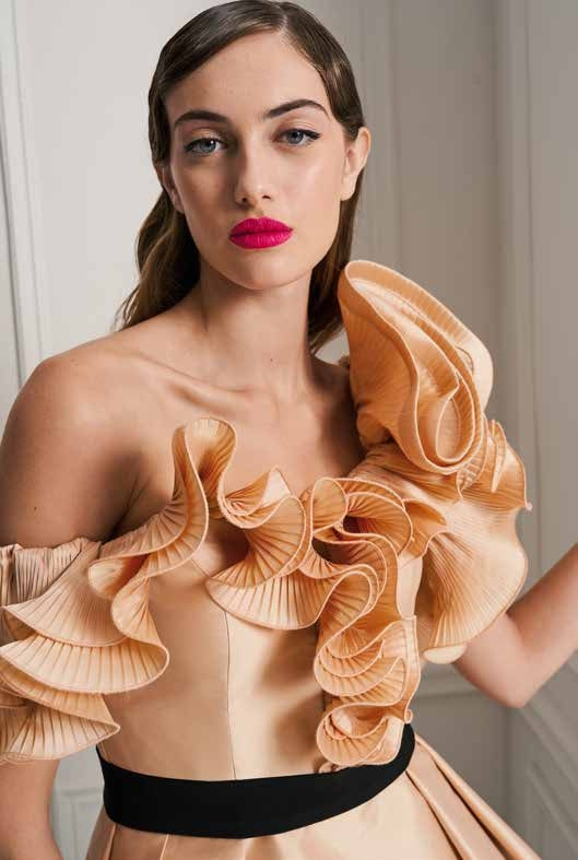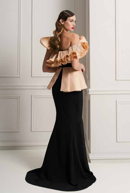 CORPETTO IN MIKADO CON RUGE DI ORGANZA PLISSETTATA, CINTURINO IN VITA, GONNELLONE SIRENA IN CADY