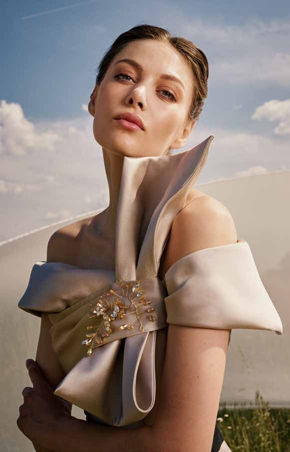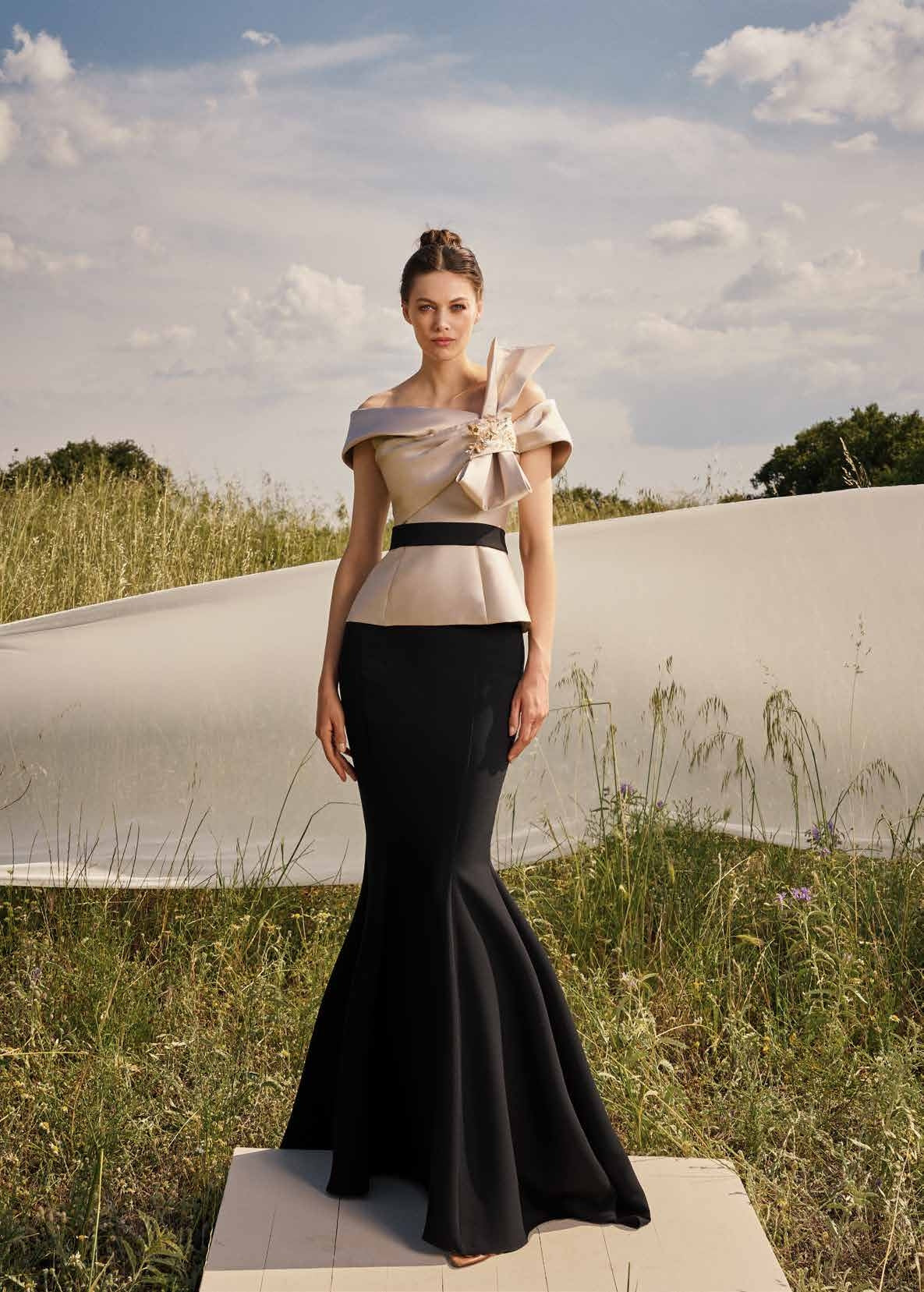 CORPETTO SCOLLATURA OMERALE, PARTICOLARE DI FIOCCO CON APPLICAZIONE GIOIELLO, ESSO E' IN MIKADO, CINTURINO IN VITA E GONNA A SIRENA IN CADY