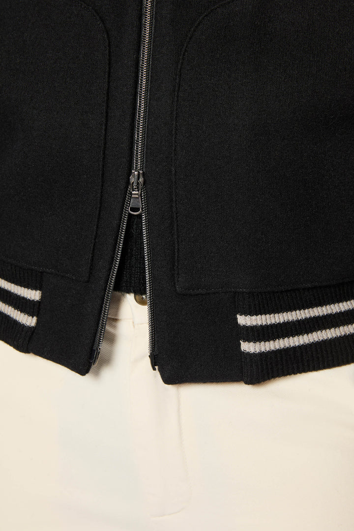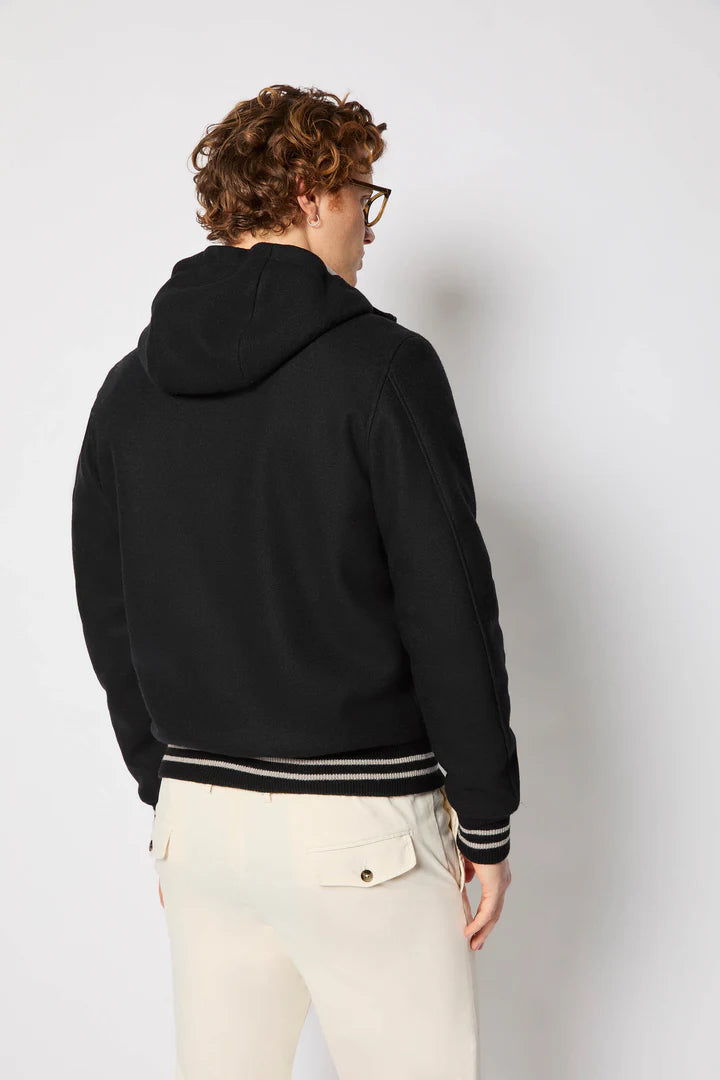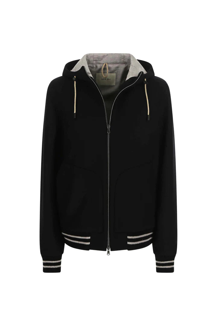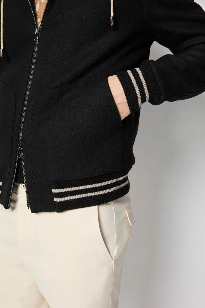 Felpa da uomo con zip frontale bidirezionale e cappuccio con coulisse nera con dettagli in contrasto beige su polsini, interno cappuccio e fondo. Dal carattere sportivo e casual questo capo è dotato di 2 comode tasche ed è perfetto per essere utilizzato nelle giornate più informali sia in sostituzione al cappotto, sia a vista come maglione.