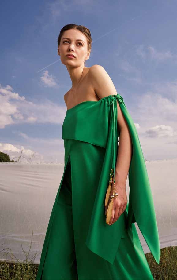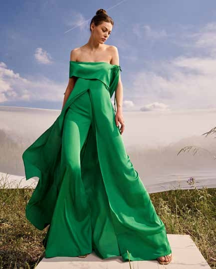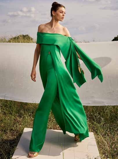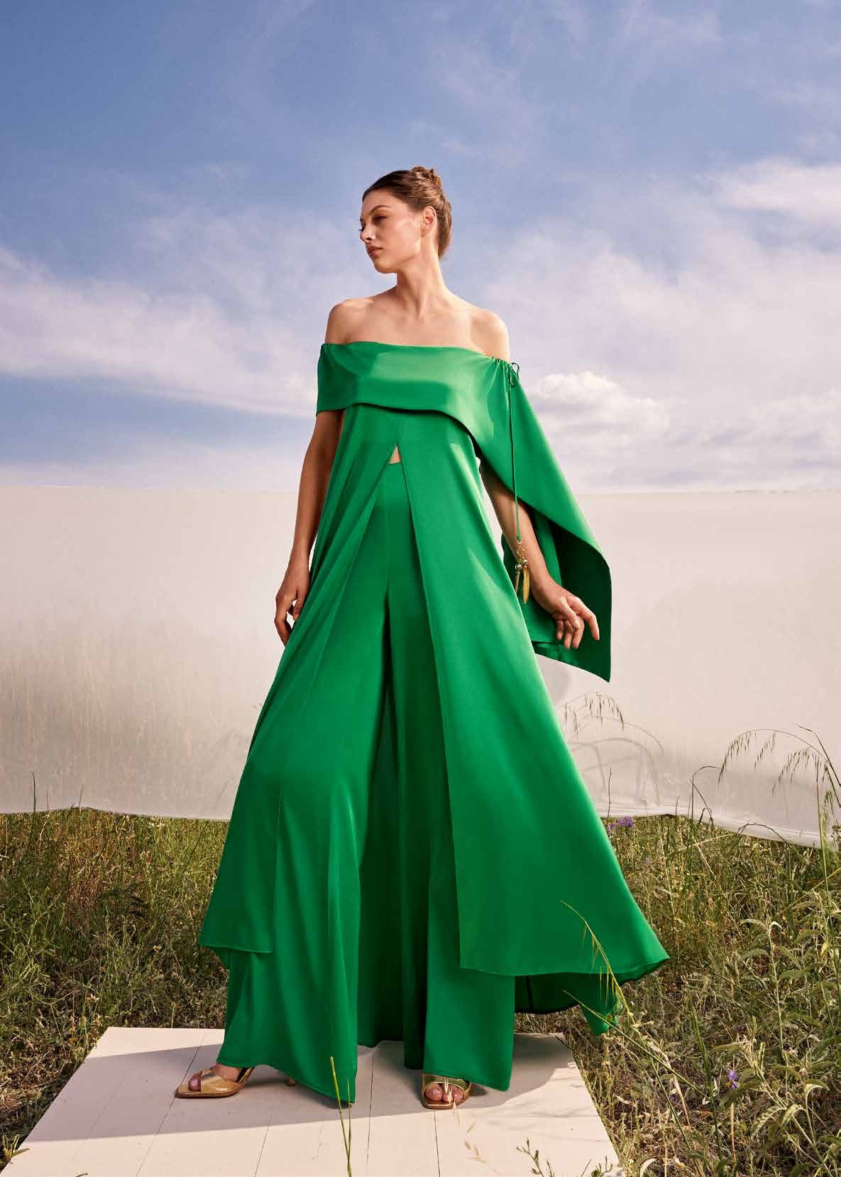 COMPLETO IN RASO COMPOSTO DA DUE PEZZI. IL CAPO SUPERIORE E' UNA TUNICA CON SCOLLATURA OMERALE, PANTALONE PALAZZO.